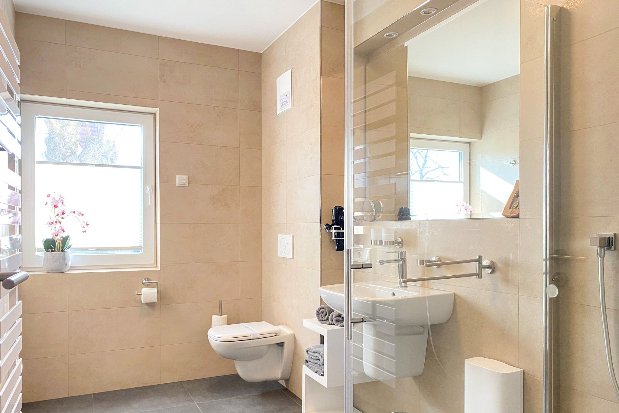 • Badezimmer: Modernes Tageslichtbad mit ebenerdiger Dusche und Fußbodenheizung