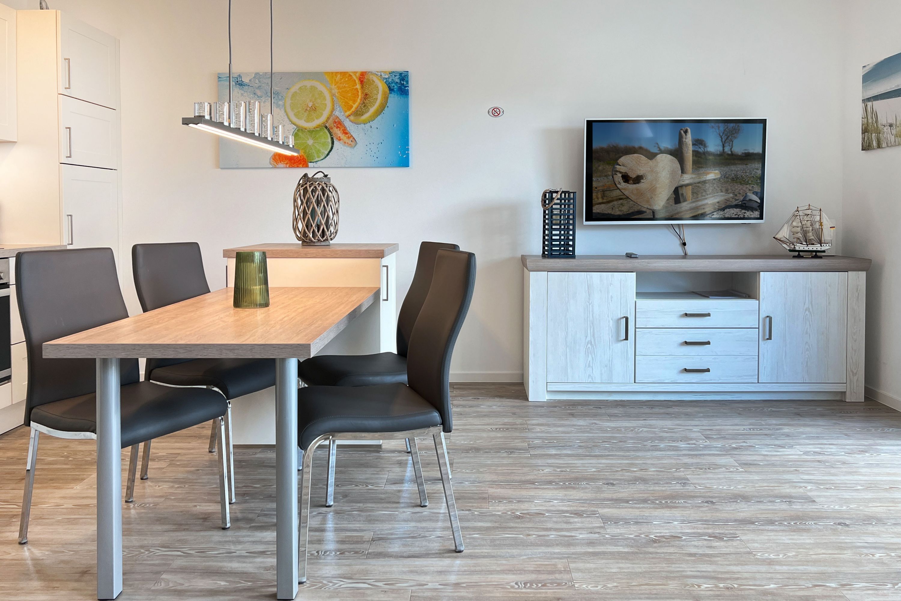 Die Ferienwohnung Tordalk, Whg. 01 empfängt Sie mit einer harmonischen Kombination aus modernem Komfort und maritimem Ambiente. Der helle Wohnbereich mit Kamin lädt zu entspannten Stunden ein, während die voll ausgestattete Küchenzeile keine Wünsche offenlässt. Genießen Sie Ihre Mahlzeiten auf der westlich ausgerichteten Terrasse und lassen Sie den Tag in gemütlicher Atmosphäre ausklingen. Das moderne Badezimmer und das komfortable Schlafzimmer bieten zusätzlichen Komfort für erholsame Nächte.