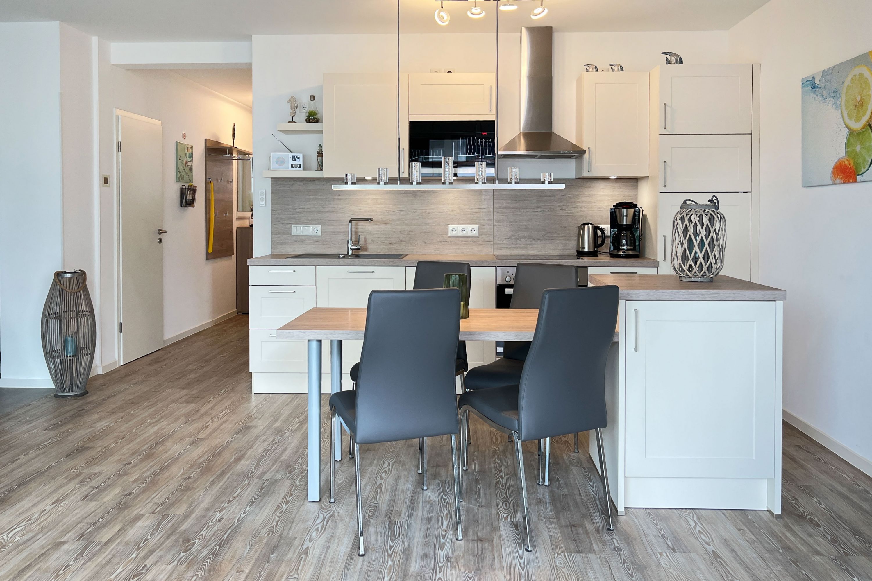 • Küche: Voll ausgestattete Küchenzeile mit Geschirrspüler, Backofen, Kochfeld, Kühlschrank, Filterkaffeemaschine, Toaster und Wasserkocher