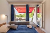 Der kombinierte Wohn- und Schlafraum verfügt über ein Doppelbett in der Größe von 180x200 cm mit getrennten Matratzen. Von hier, oder von den schicken Sesseln aus, können Sie bequem fernsehen.