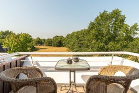 Ein Esstisch mit drei Stühlen bietet eine angenehme Sitz-, und Aufenthaltsmöglichkeit. Aber auch der Balkon ist mit zwei Stühlen, einem Tisch und einer Markise gut ausgestattet. Genießen Sie bis in den Abend hinein die Sonne und den entspannenden Blick ins Grüne.