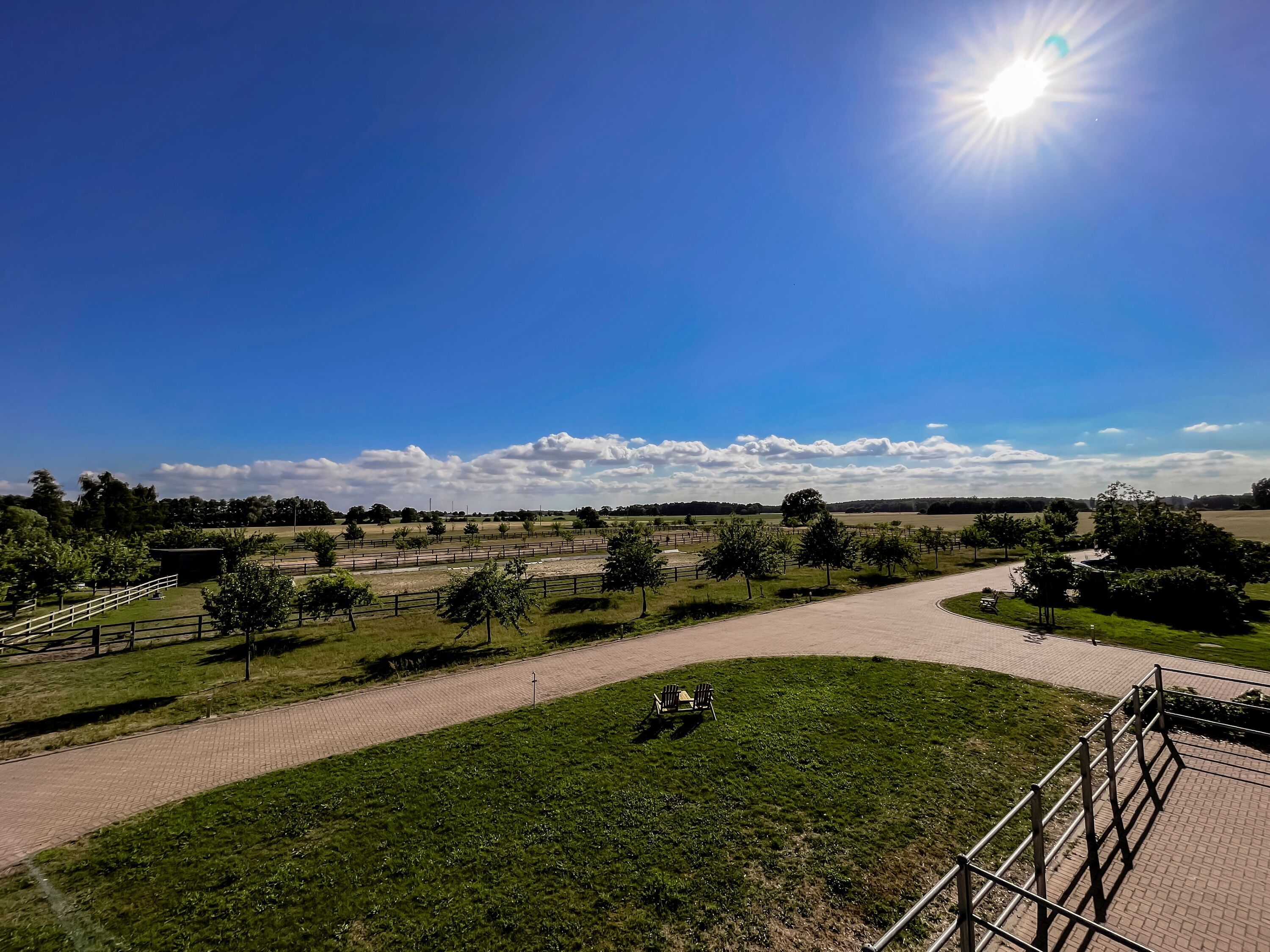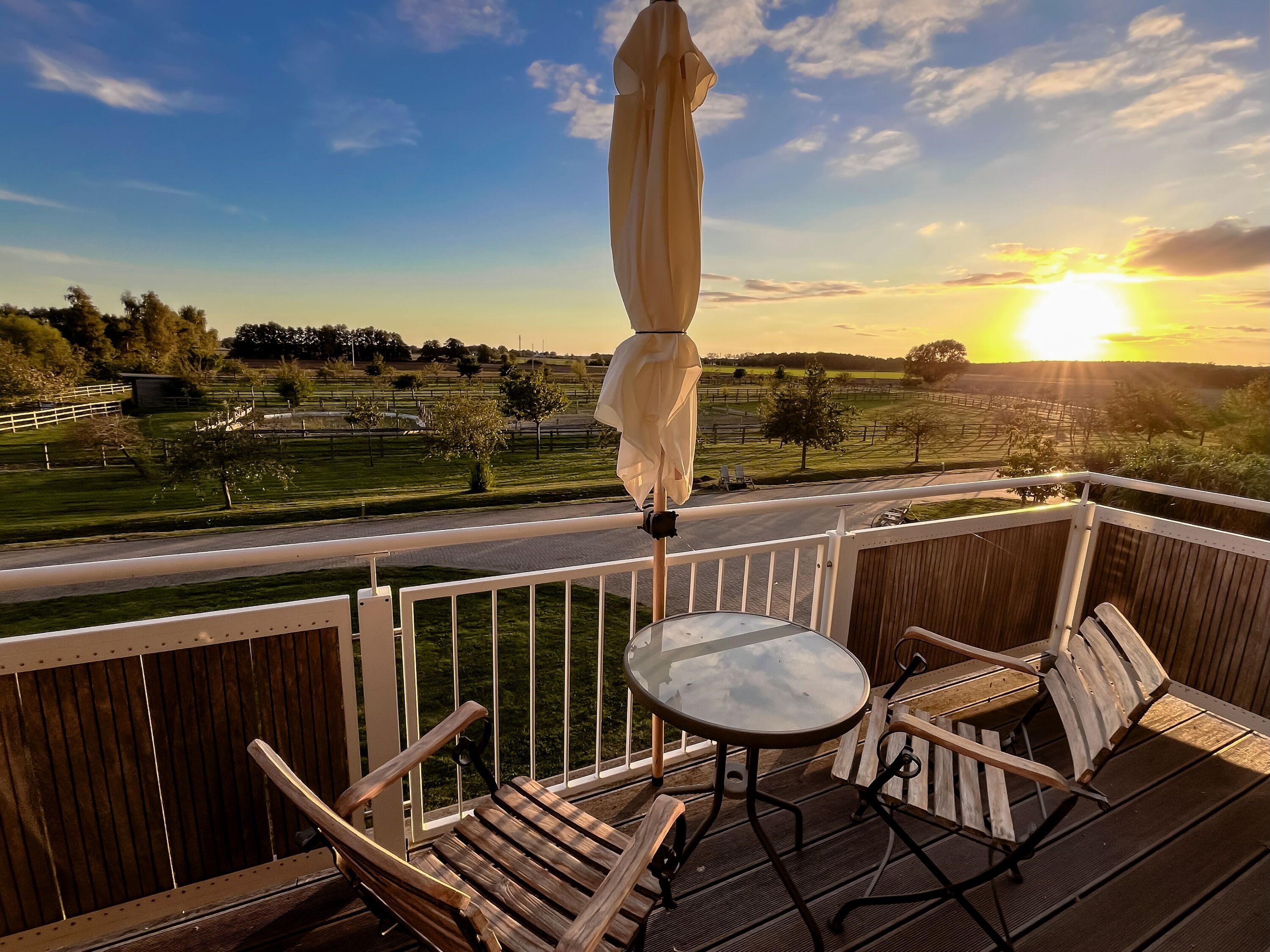 Balkon: Vom Wohnbereich aus gelangen Sie auf einen großzügigen Balkon mit Gartenmöbeln und Sonnenschirm, der einen weiten Blick über die Pferdekoppel, Wiesen und Felder bietet.