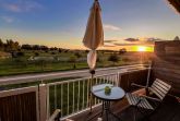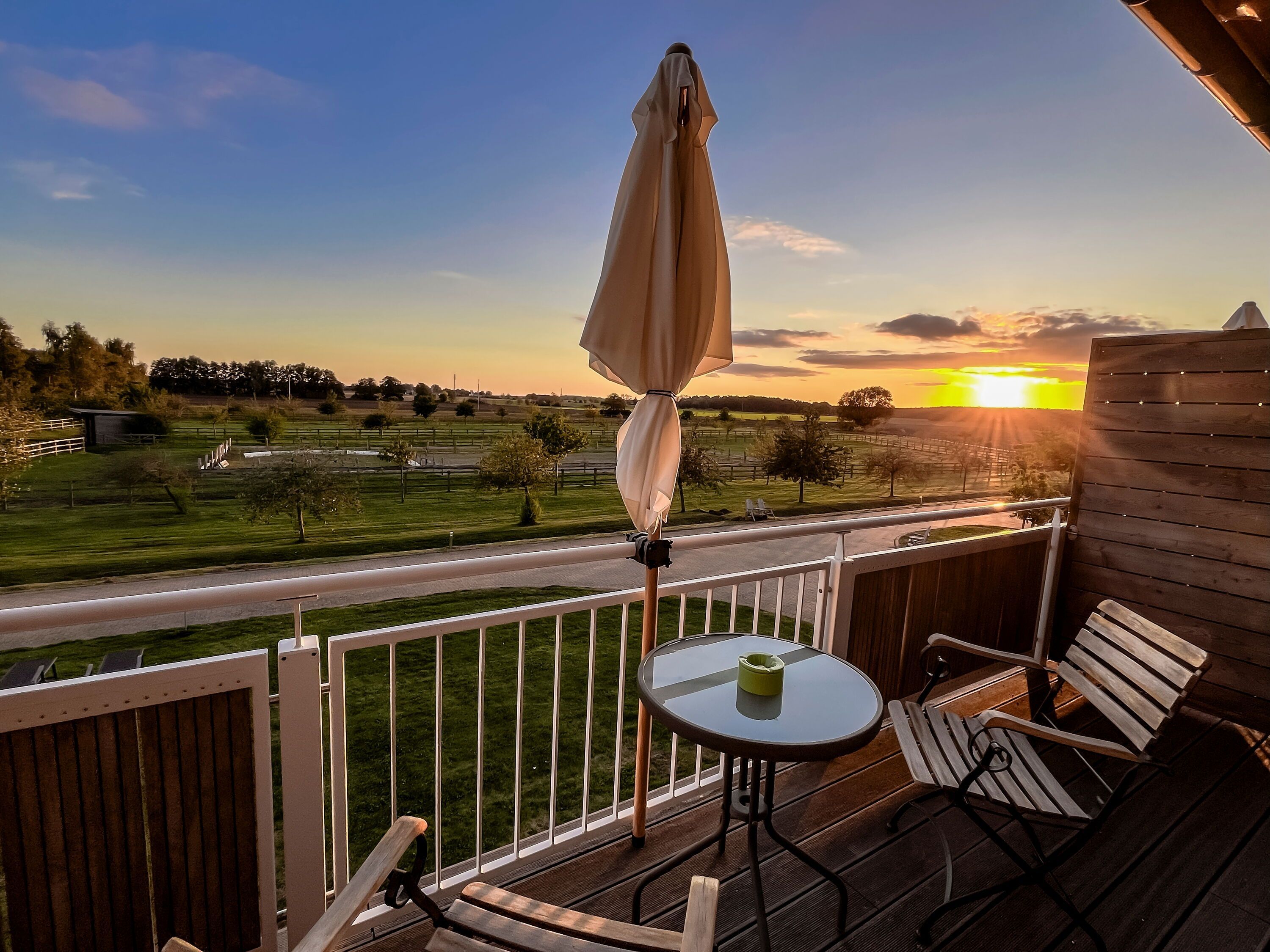 Balkon: Vom Wohnbereich aus gelangen Sie auf einen großzügigen Balkon mit Gartenmöbeln und Sonnenschirm, der einen weiten Blick über die Pferdekoppel, Wiesen und Felder bietet.