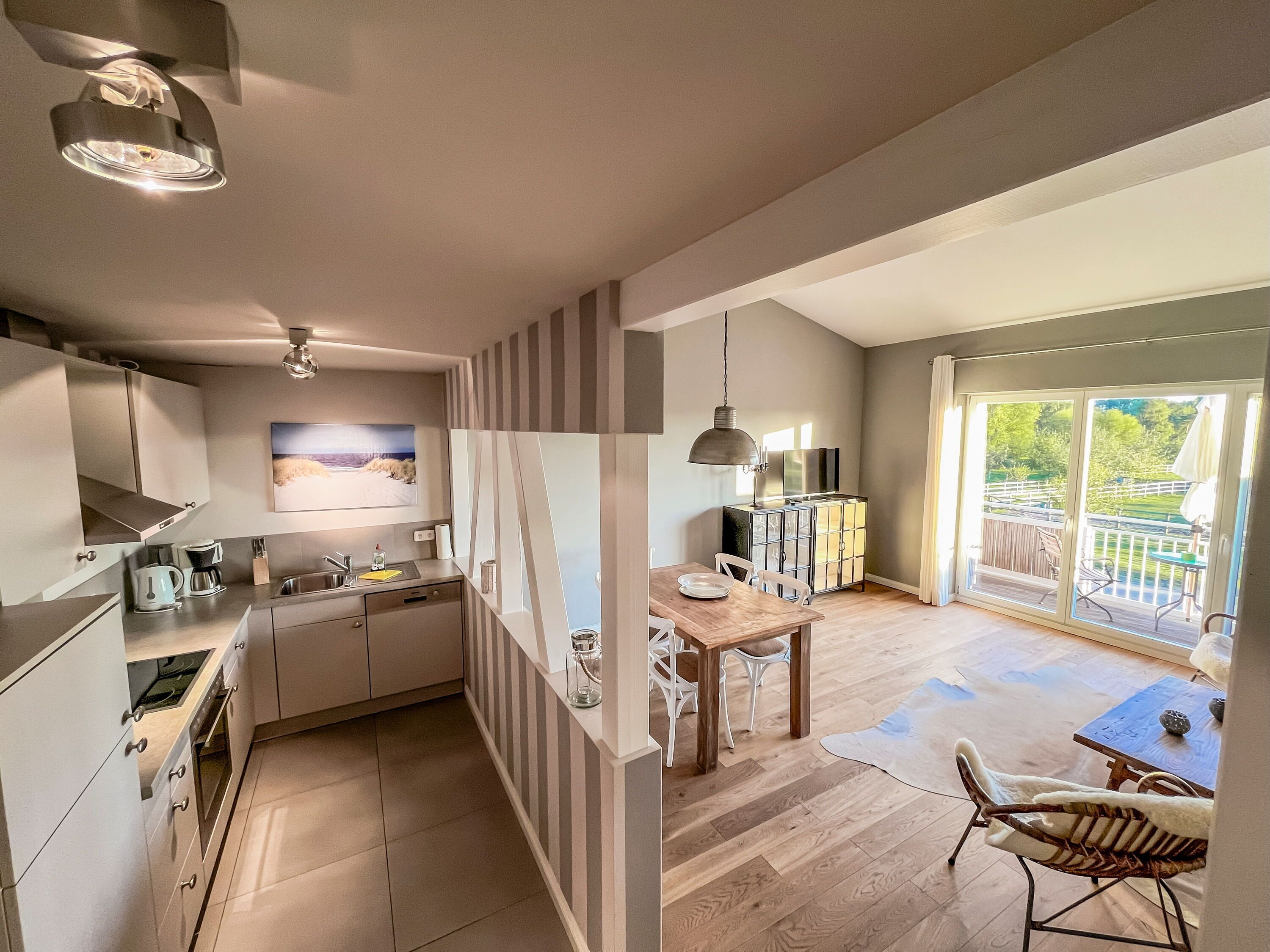 Erleben Sie einen unvergesslichen Urlaub auf dem Lerchenhof, einem herrschaftlichen Anwesen in sehr ruhiger und naturnaher Lage auf der Halbinsel Lieper Winkel auf Usedom. Das hochwertig ausgestattete Maisonette-Appartement, das sich in einem modernen Ausbau über dem Pferdestall befindet, bietet hohen Komfort und eine stilvolle Einrichtung im gehobenen Landhausstil.
