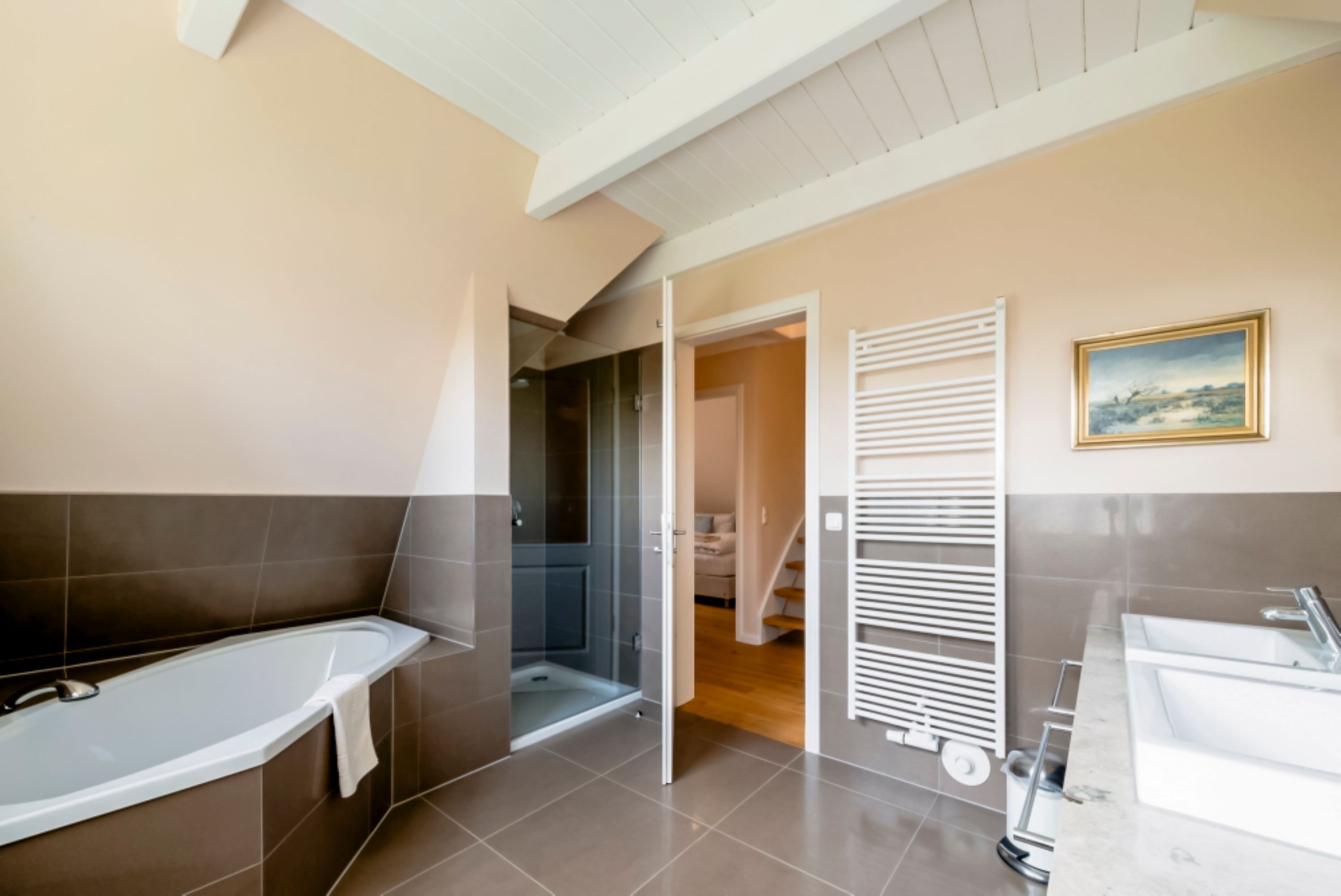• Badezimmer: Eckbadewanne, Dusche, Waschtisch und WC.