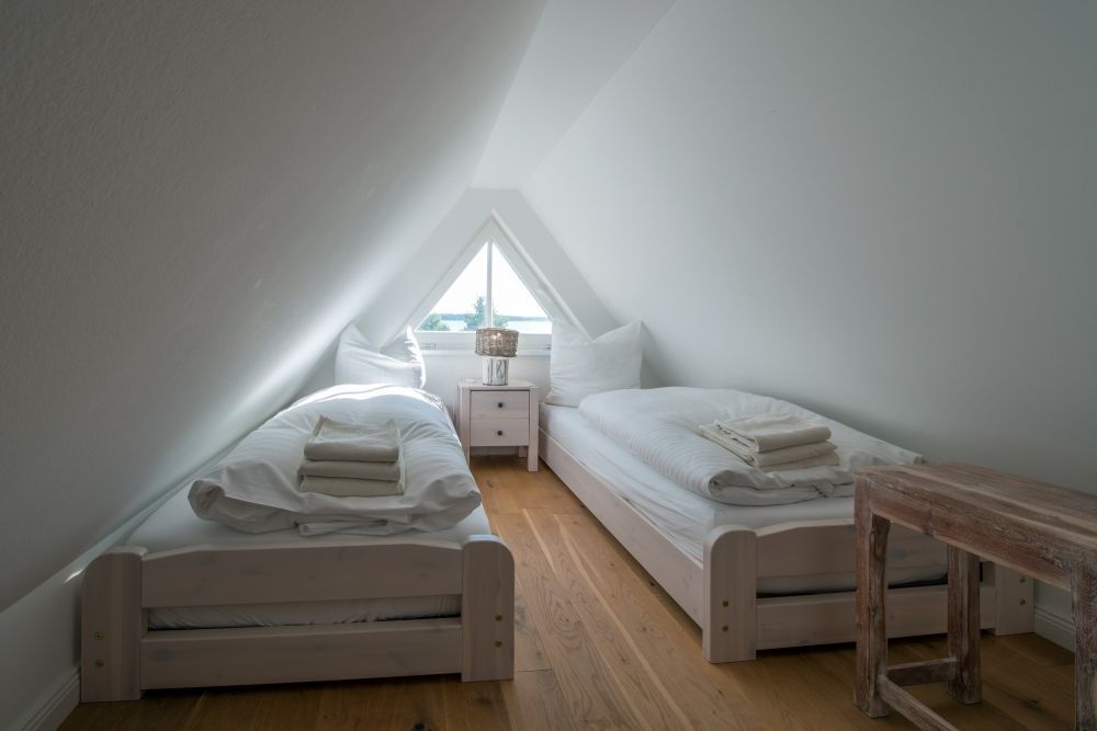 • Zwei Schlafzimmer mit komfortablen Doppelbetten, eines davon ausgestattet mit TV. Der Zugang zur Schlafgalerie im Dachgeschoss erfolgt über eine innenliegende Treppe innerhalb eines der Schlafzimmer.
