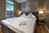Als Rückzugsort erwartet Sie zwei Schlafzimmer mit Boxspringbetten in 180x200 cm und einem großen Kleiderschrank. Die Ferienwohnung verfügt über ein Bad mit Dusche, sowie einem separaten WC mit Handwaschbecken.