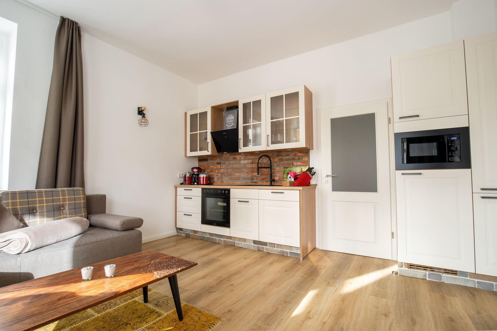 Die im offenen Wohnbereich integrierte Küchenzeile lädt förmlich dazu ein, mal wieder den Kochlöffel zu schwingen. Sie verfügt über ein Cerankochfeld, Geschirrspüler und einer Auswahl an Kochutensilien.