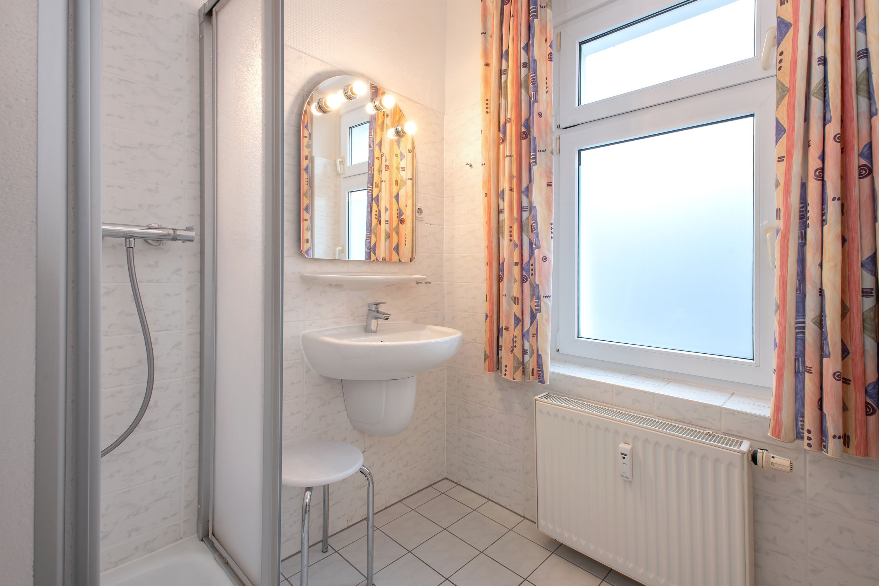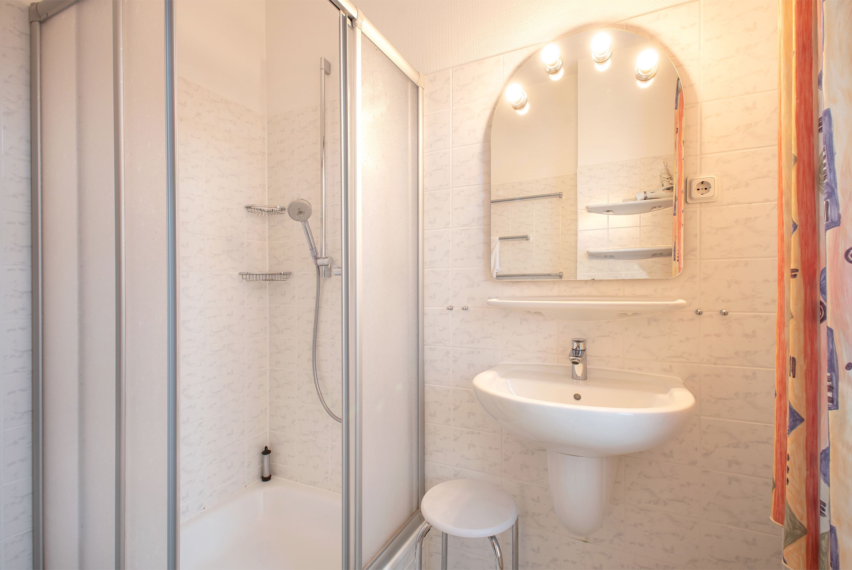 Für einen angenehmen Komfort im Badezimmer sorgen eine Dusche, Waschtisch und Haartrockner., sowie ein separates WC mit Handwaschbecken.