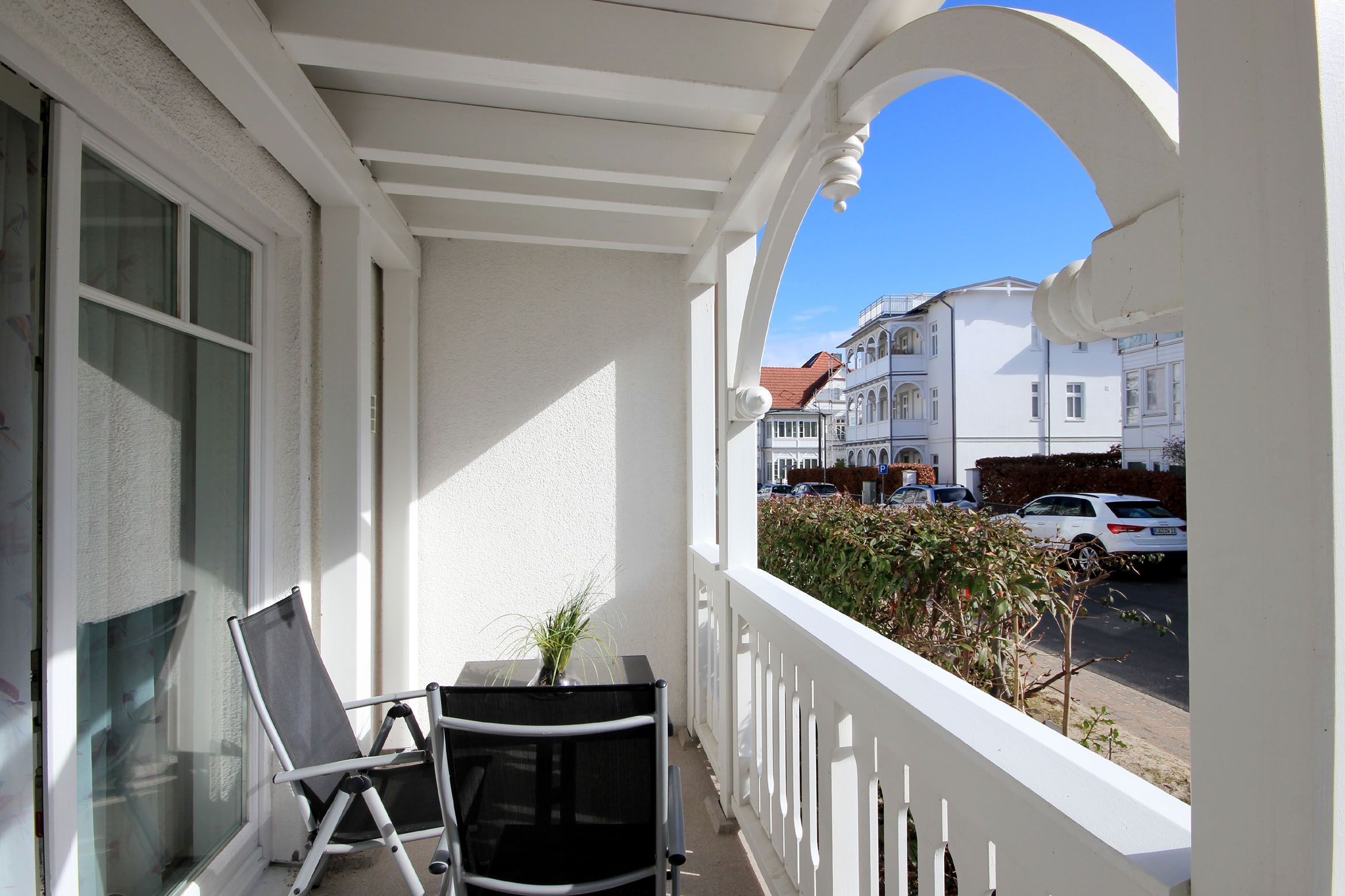Ihre Ferienwohnung 1RB14 befindet sich im Erdgeschoss des Hauses und ist für bis zu 4 Personen ausgestattet. Auf dem überdachten Balkon nach Süden können Sie gemeinsam verweilen. Die 2 Zimmer - Wohnung hat eine Größe von ca. 50 qm. Neben dem Wohnraum mit integrierter Kochecke gibt es einen separaten Schlafraum, Flur und ein Badezimmer mit Waschbecken, Dusche und WC. Im Schlafraum befindet sich ein gemütliches Doppelbett. Ein Kleiderschrank befindet sich im Flurbereich der Wohnung. Im Wohnraum können auf dem Schlafsofa weitere zwei Personen schlafen. Außerdem finden Sie im Wohnraum neben der Sitzecke einen separaten Essplatz, Flachbild-TV, Musikanlage und WLAN. Die Kochecke ist mit Geschirrspüler, Kühlschrank mit kleinem Gefrierfach, Mikrowelle, Kaffeemaschine, Wasserkocher, Toaster und weiteren Küchenutensilien komplett ausgestattet. Ein wohnungseigener Parkplatz steht für Sie direkt am Haus zur Verfügung. Den Münz-Waschtrockner können Sie im Keller des Hauses nutzen. Der Fahrradabstellraum befindet sich nebenan.