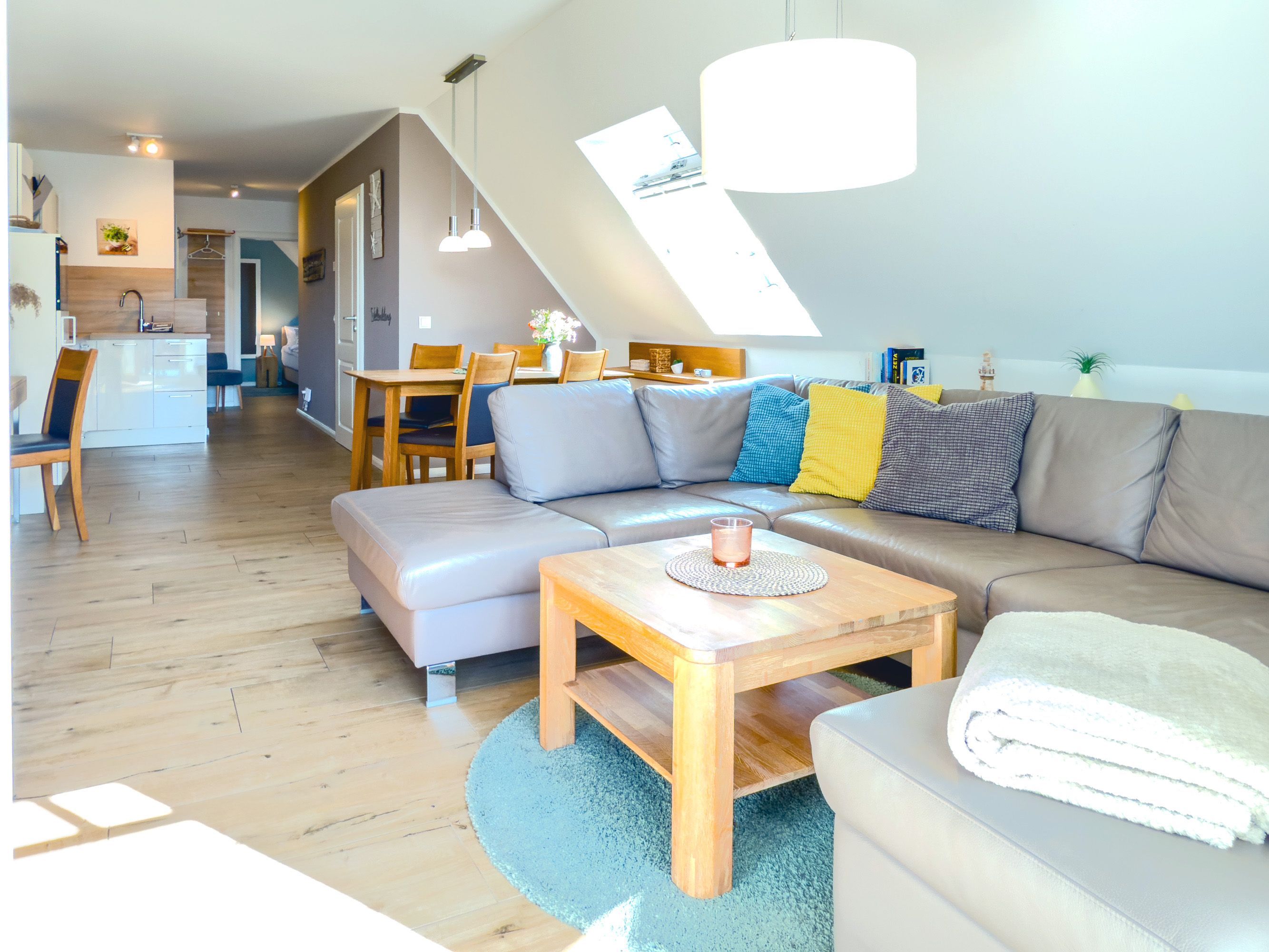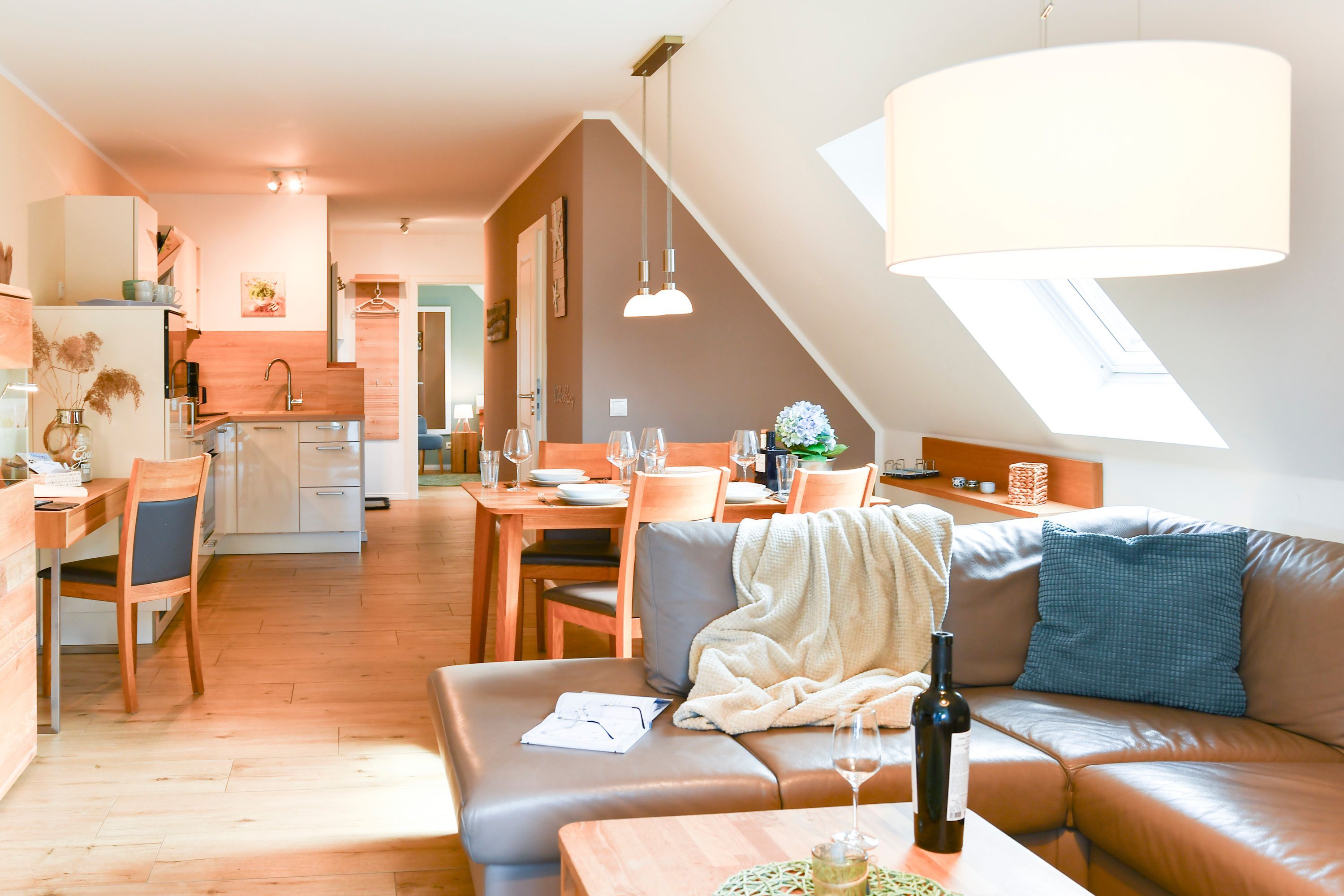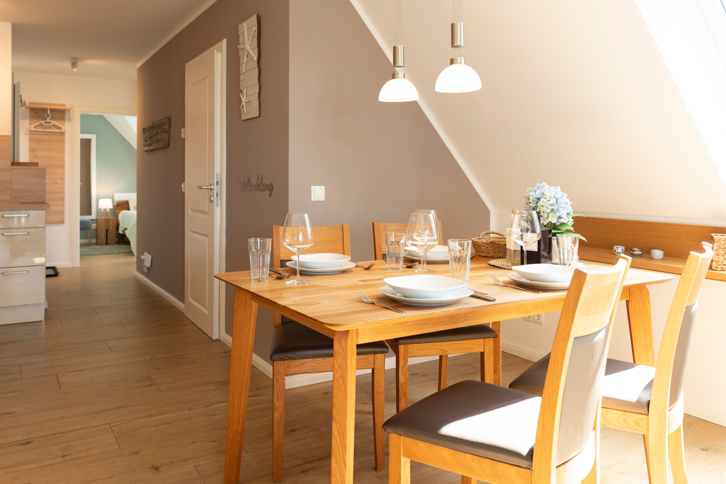 Die Ferienwohnung Wellenklang empfängt Sie mit einer modernen und einladenden Atmosphäre. Der offene Wohn- und Essbereich mit bequemer Couch bietet den perfekten Ort für entspannte Abende. Die voll ausgestattete Küchenzeile verfügt über moderne Geräte, sodass Sie mühelos kulinarische Köstlichkeiten zubereiten können. Die beiden separaten Schlafzimmer sorgen für erholsamen Schlaf.