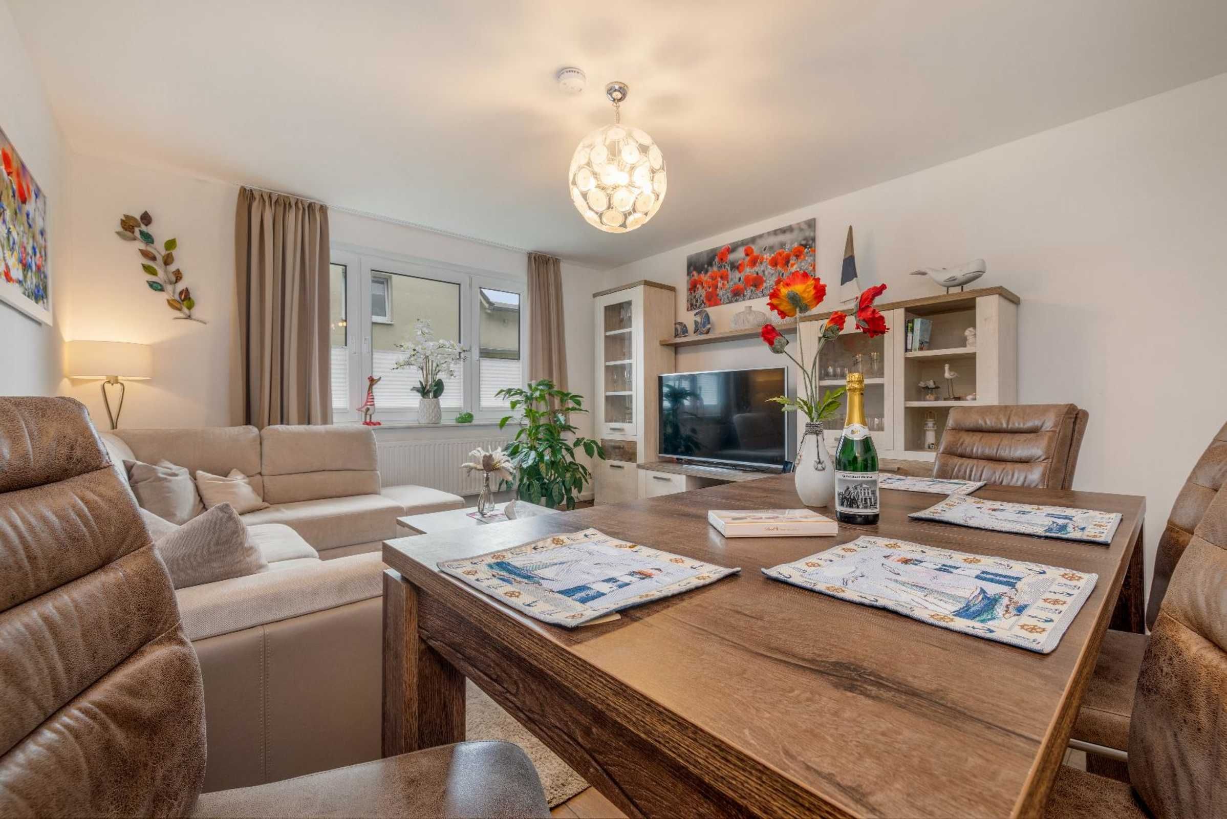 Das Wohnzimmer hat einen großen Flachbild-TV sowie Essecke. Die gesamte Wohneinheit ist barrierefrei und mit Einschränkungen für Rollstuhlfahrer geeignet - bitte direkte Anfragen stellen.