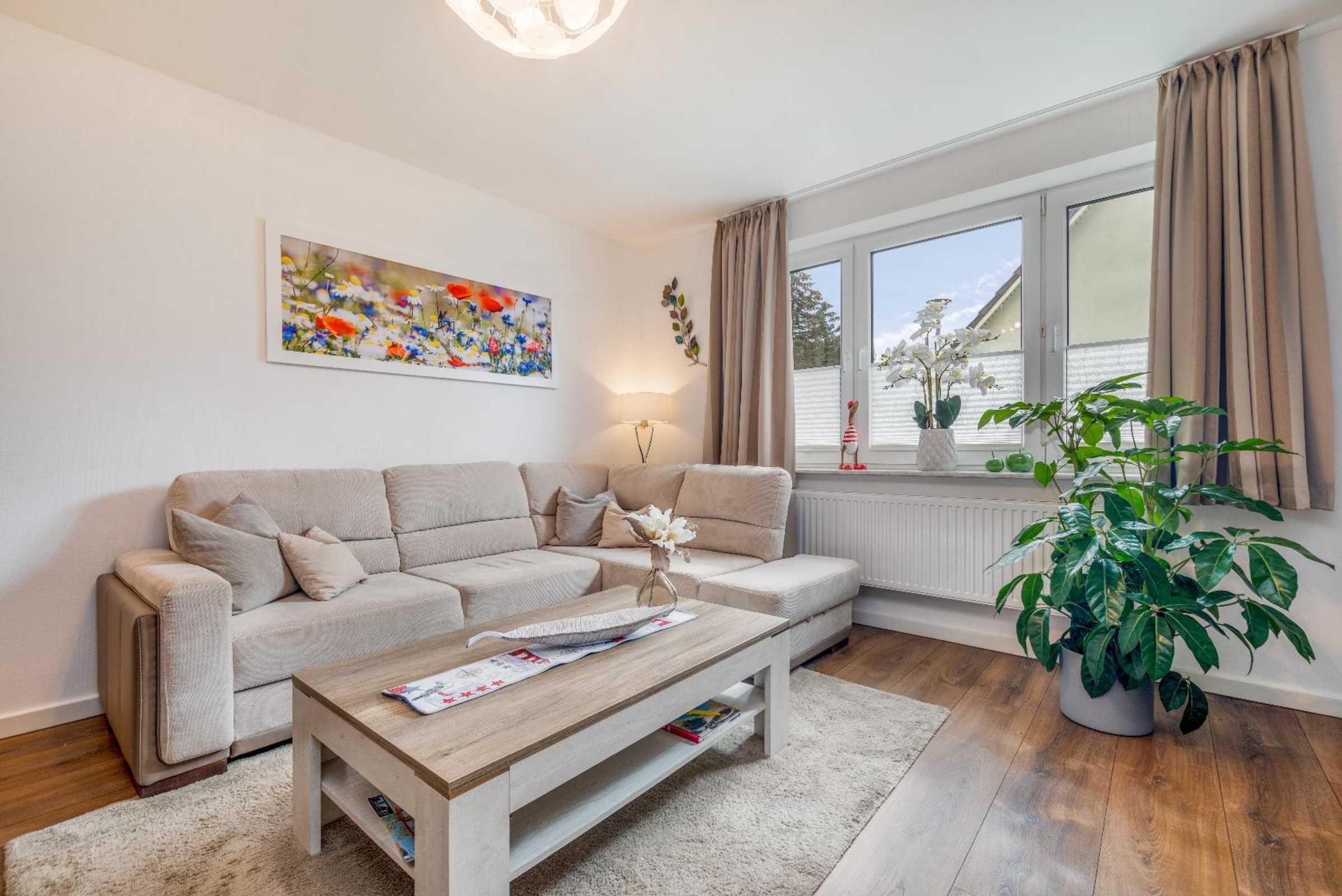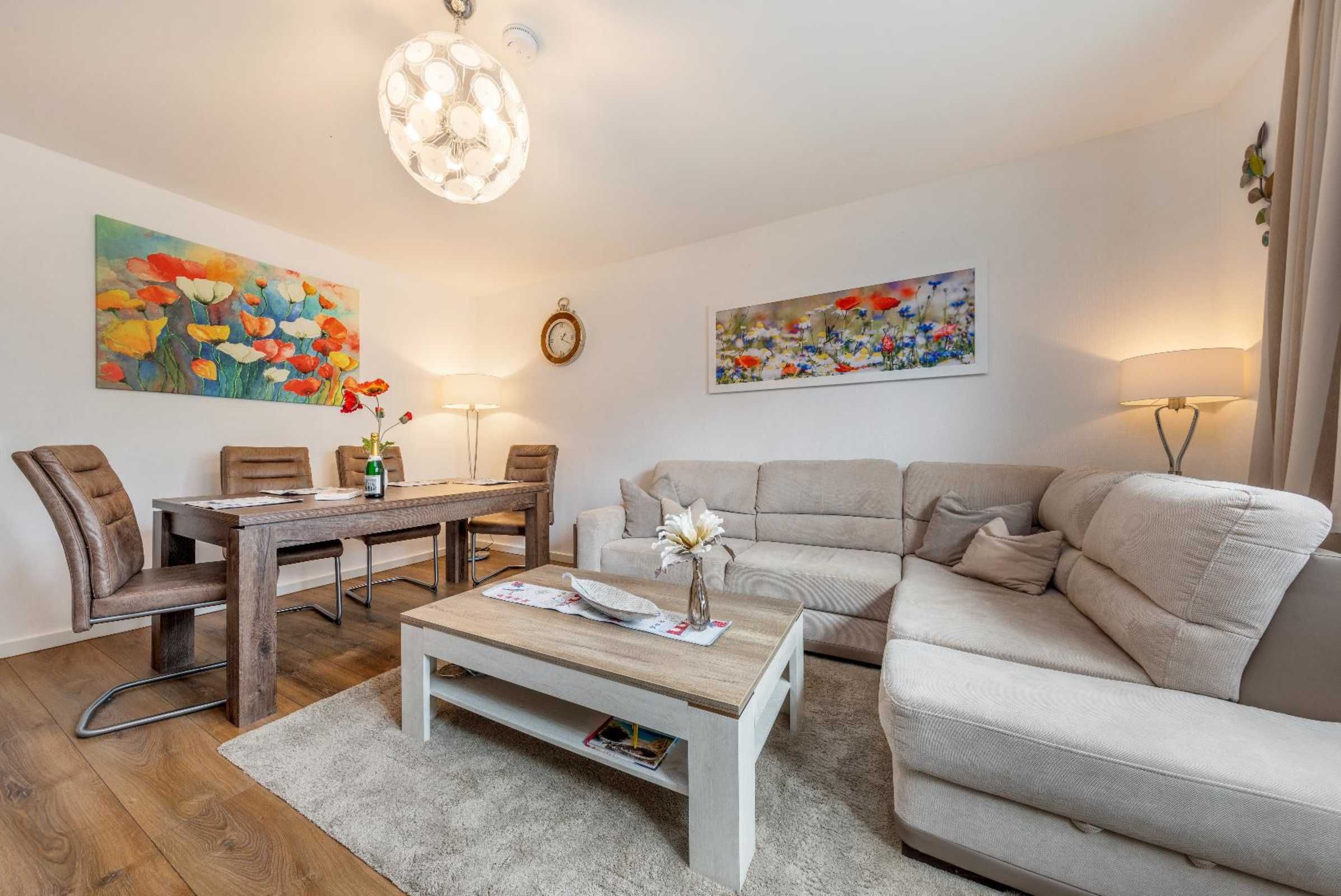 Ferienwohnung mit 2 Schlafzimmern im EG, barrierefrei, 1 Wohnzimmer, 1 Küche, 1 Bad mit ebenerdiger Dusche, Gartennutzung mit Grillmöglichkeit und Feuerstelle, Fahrräder vorhanden im abschließbaren Abstellraum sowie Pkw-Stellplatz