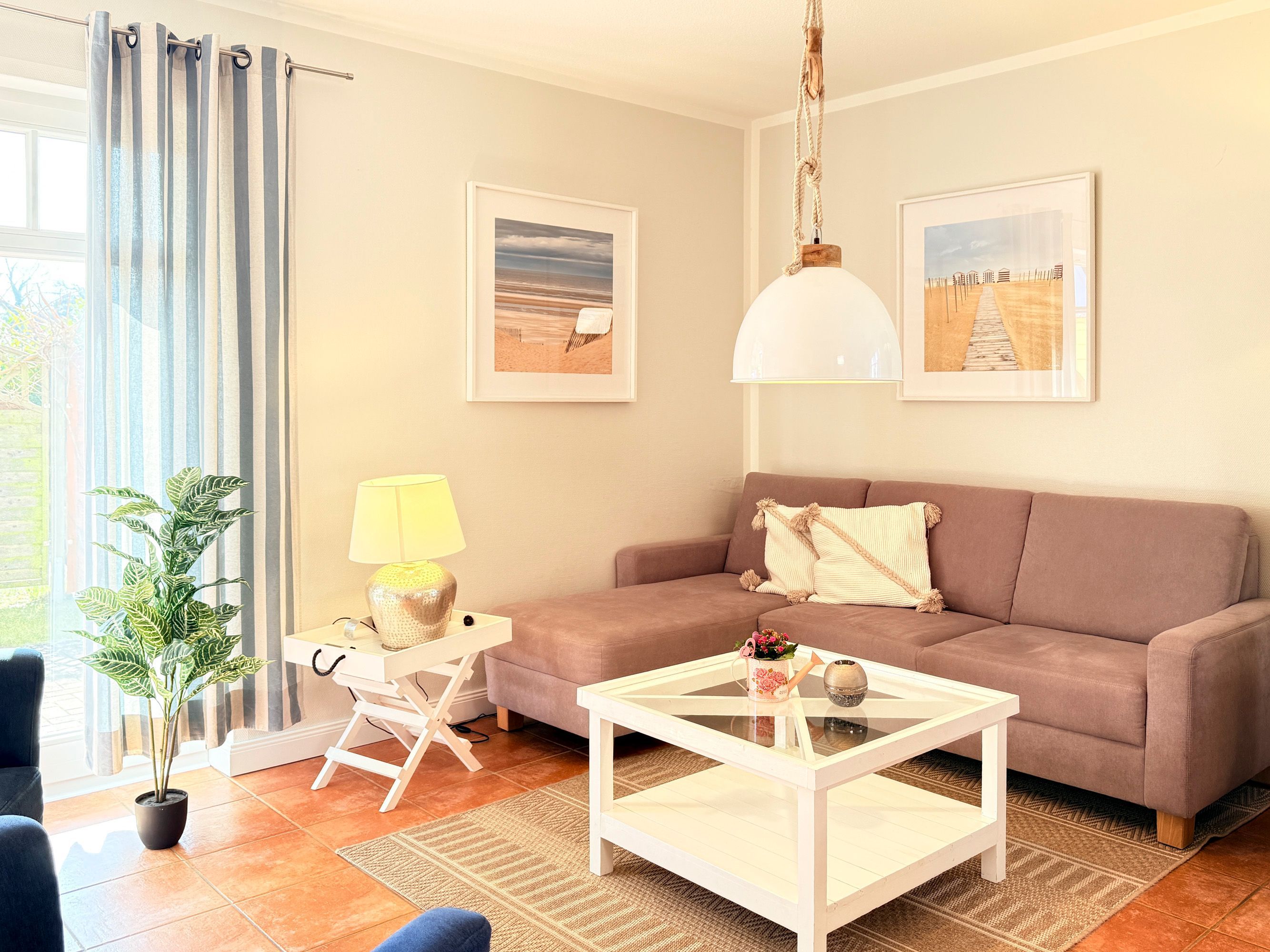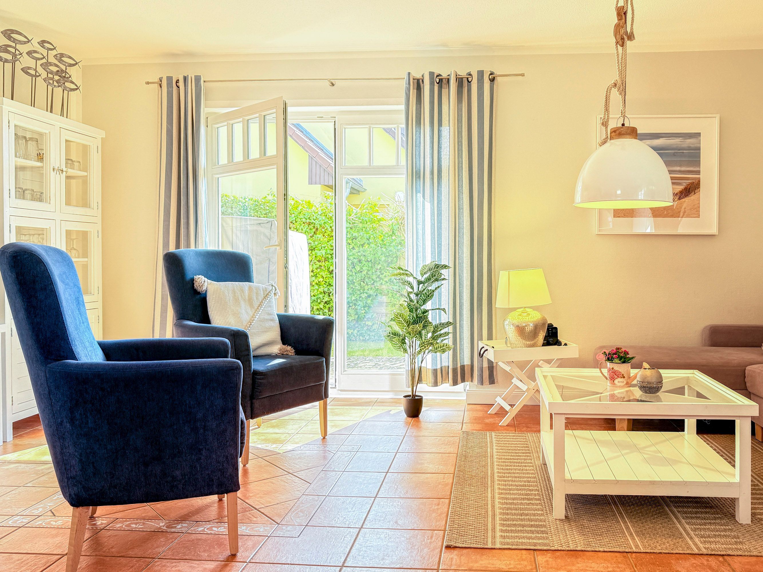 • Gemütlicher Wohnbereich mit Kamin und Blick in den Garten