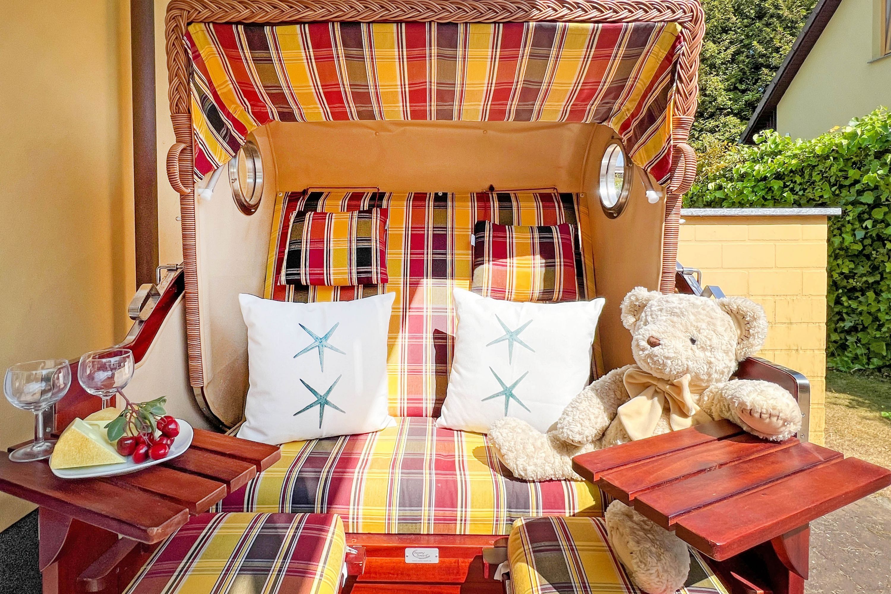 • Sonnige Terrasse mit Strandkorb und Gartenmöbeln
