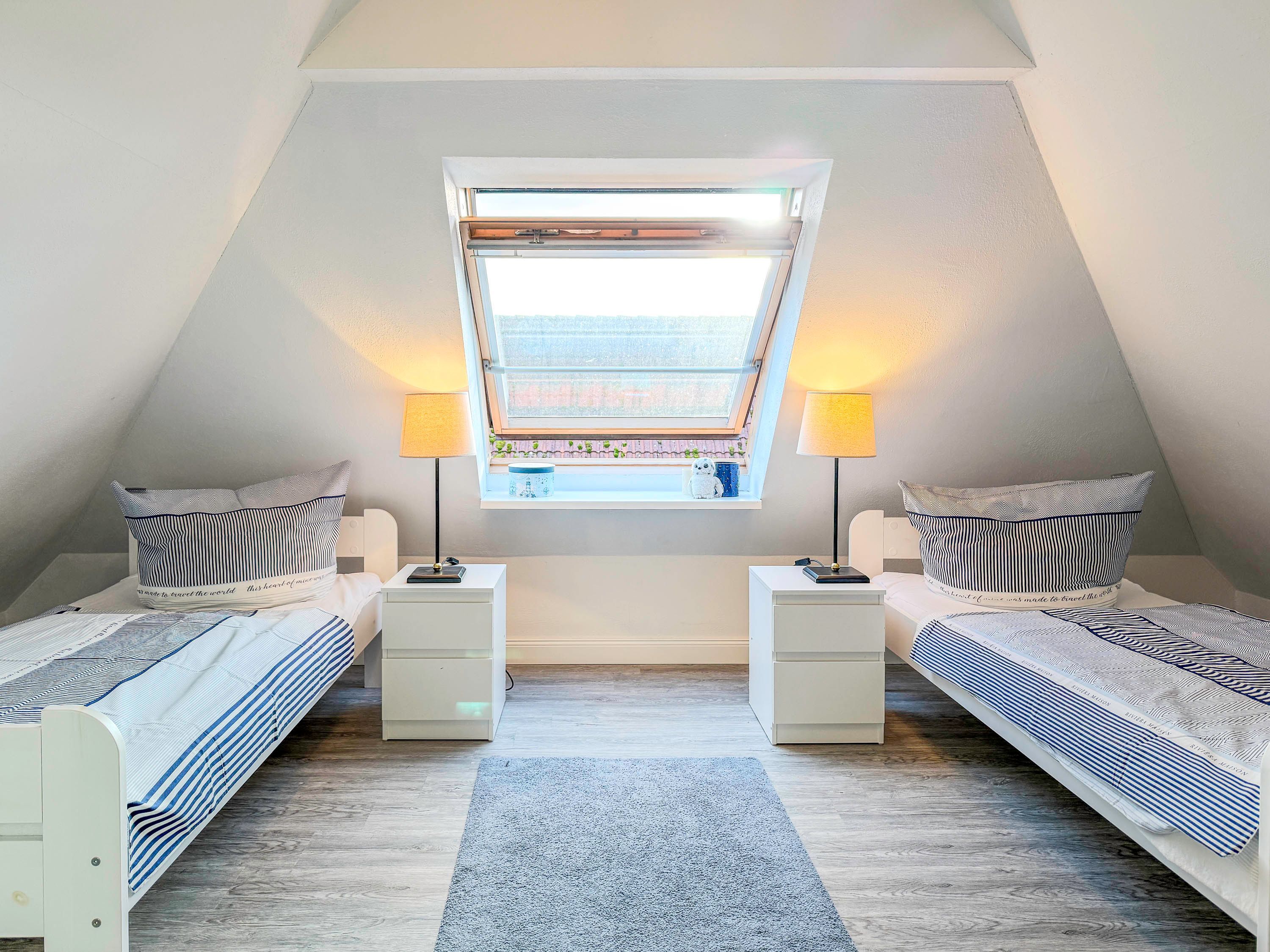 • Zwei Schlafzimmer: Ein Schlafzimmer mit Doppelbett (180 x 200 cm) und ein weiteres mit zwei Einzelbetten (90 x 200 cm)