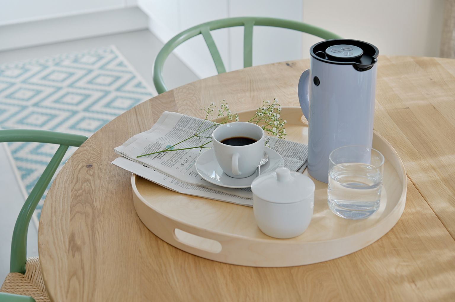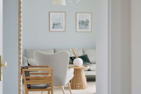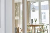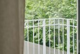 Bodentiefe Fenster ermöglichen einen direkten Zugang zum Balkon, welcher mit Gartenmöbeln ausgestattet ist. Ausgewählte Möbel und hochwertige Böden, schaffen Gemütlichkeit und ein ruhiges Raumgefühl.