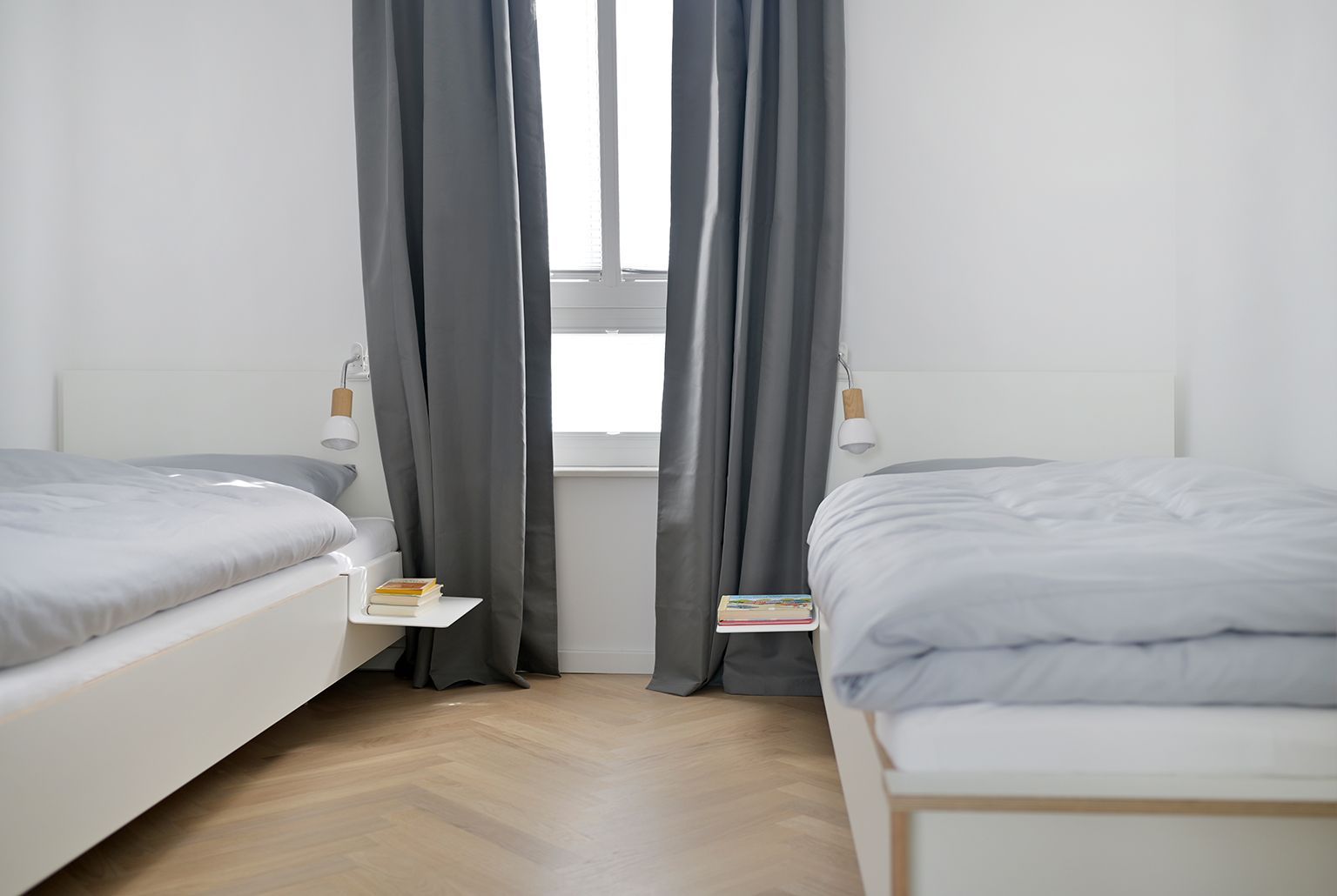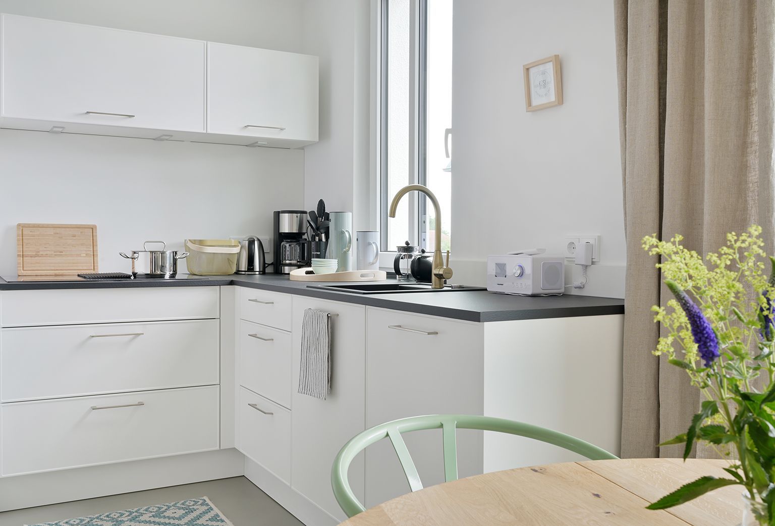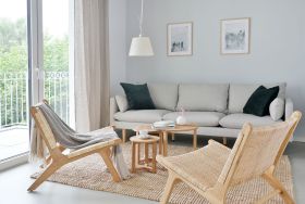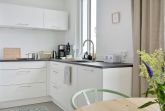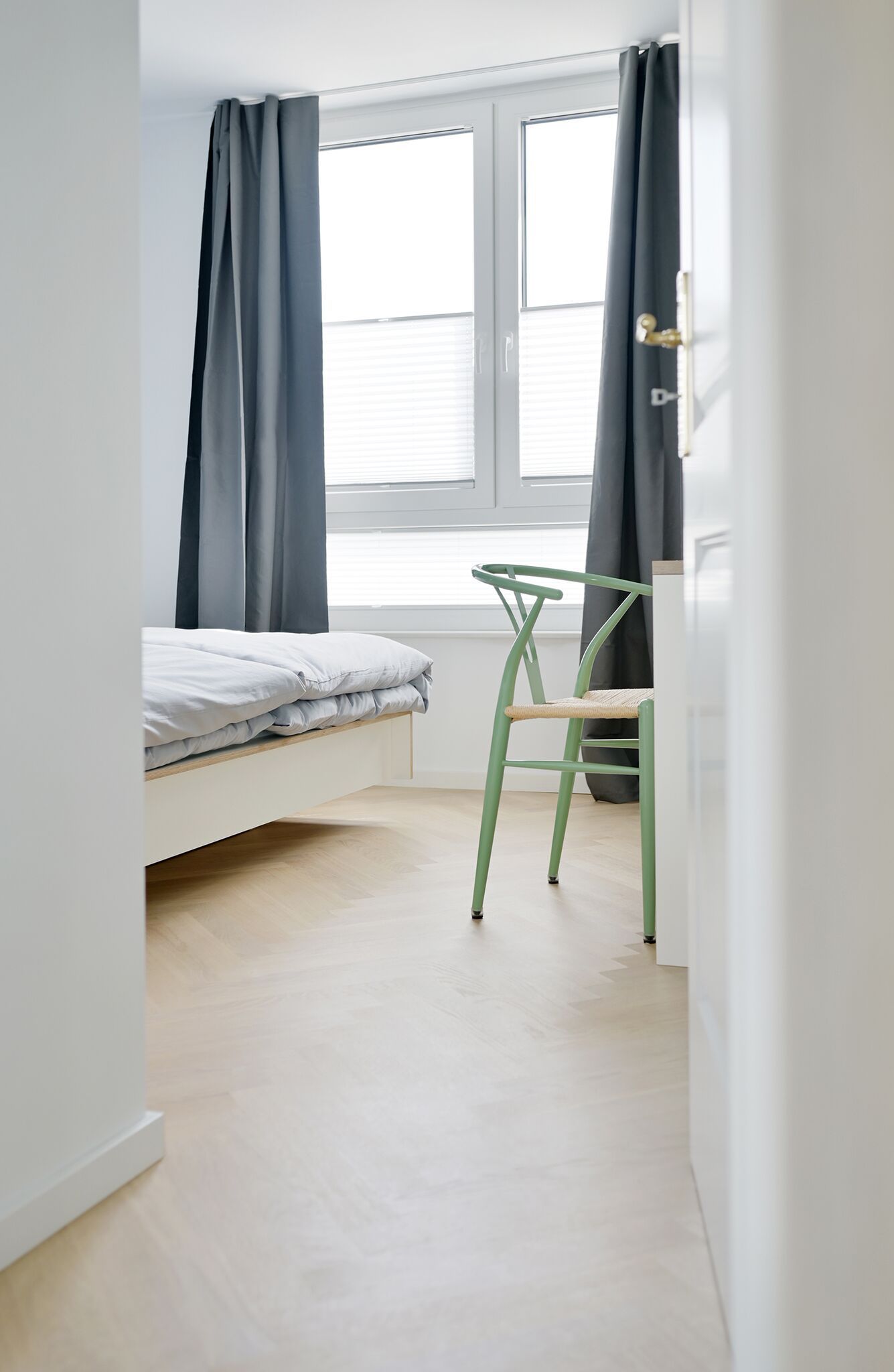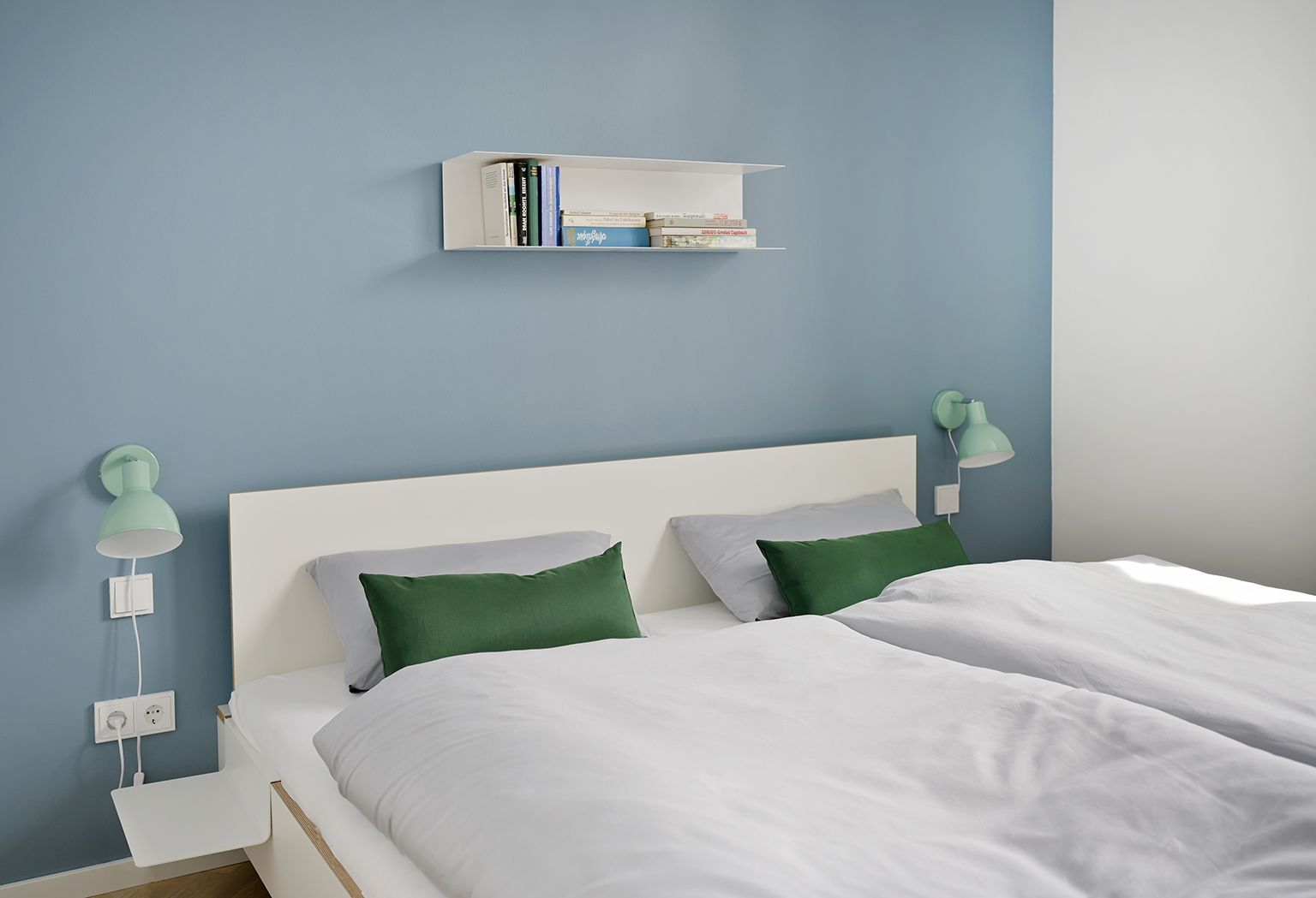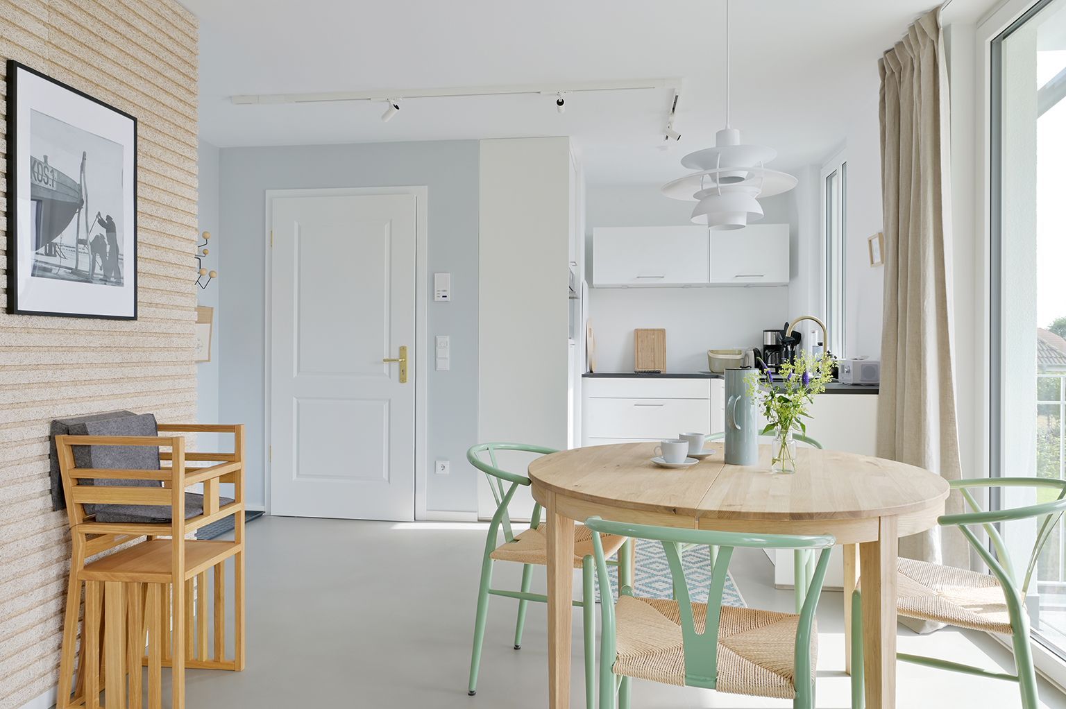 Die lichtdurchflutete 3-Zimmerwohnung des vorderen Apartmenthauses bietet mit einer Fläche von 53 m² Aufenthaltsmöglichkeiten für 2-4 Personen. Eine offene, vollausgestattete Küche schafft hohe Transparenz zum Wohnraum und lädt zu gemeinsamer zeit ein. Die Einrichtung der Wohnung fokussiert sich auf ein modernes und gleichzeitig gemütliches Interieur.