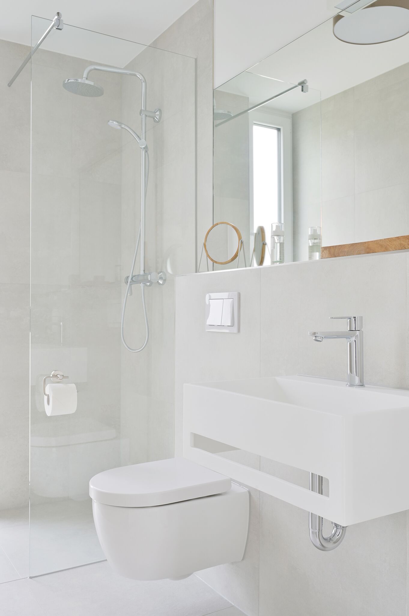 Das Badezimmer ist mit einer bodengleichen Dusche mit Regendusche ausgestattet.