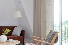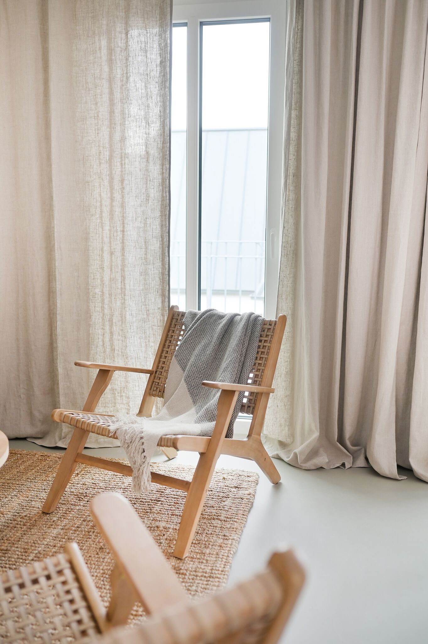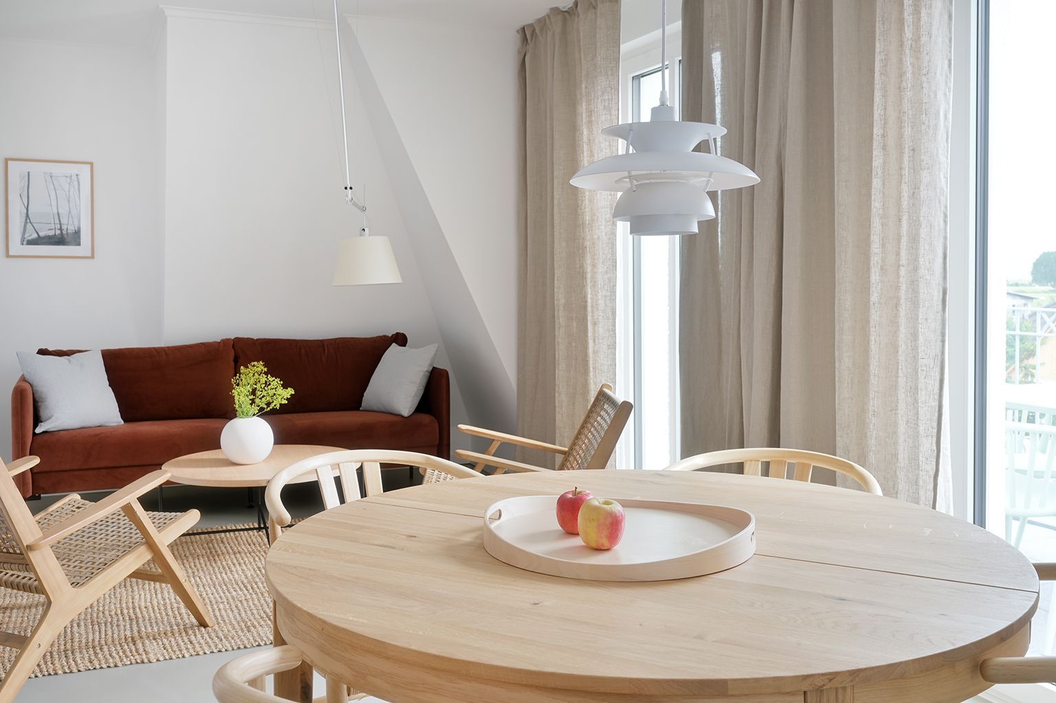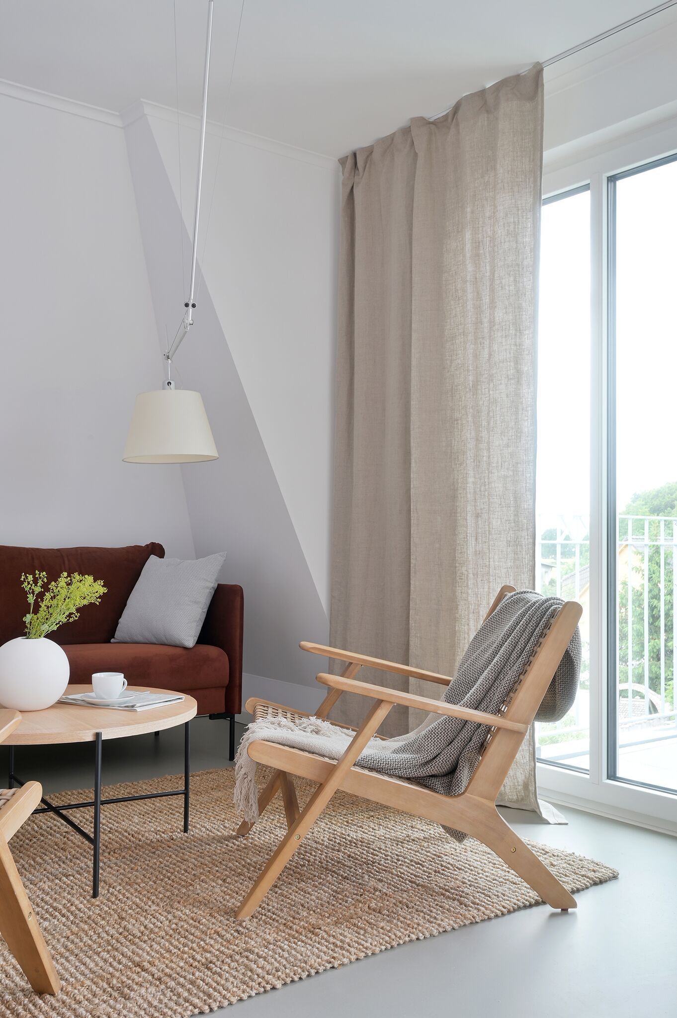 Bodentiefe Fenster ermöglichen einen direkten Zugang zum Balkon, welcher mit Gartenmöbeln ausgestattet ist. Ausgewählte Möbel und hochwertige Böden, schaffen Gemütlichkeit und ein ruhiges Raumgefühl.