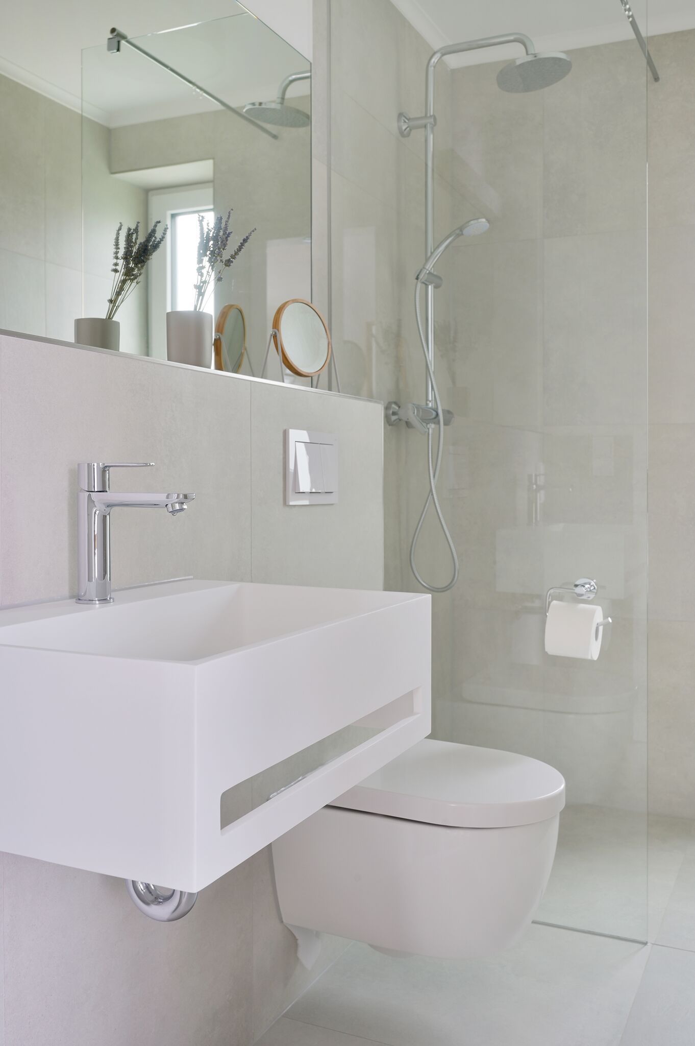 Das Badezimmer ist mit einer bodengleichen Dusche mit Regendusche ausgestattet.