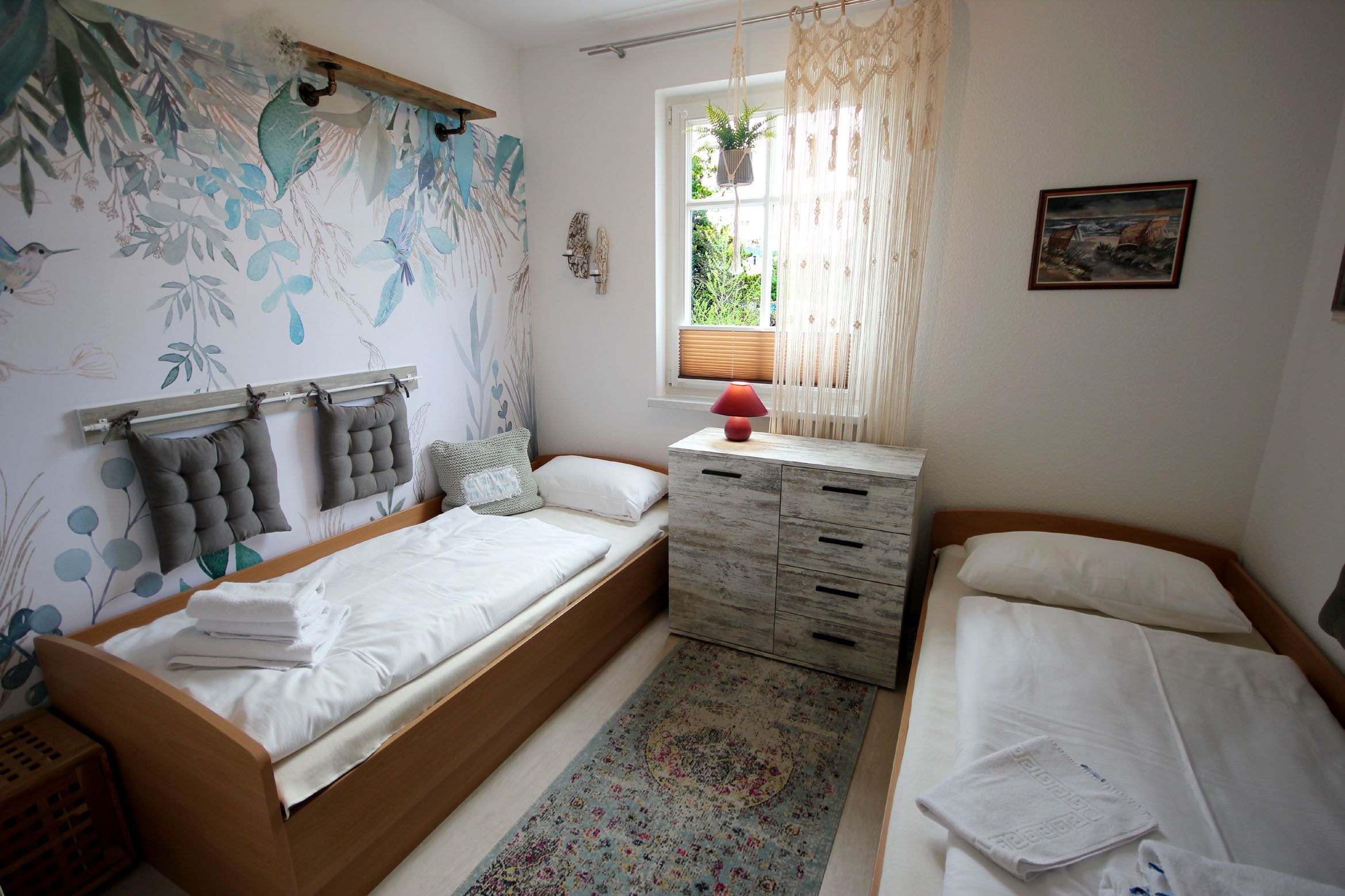 Diese moderne und mit Liebe zum Detail eingerichtete 3-Zimmer Nichtraucherwohnung 90789 dat twiehuus ist ca. 69 qm groß und befindet sich im Erdgeschoss. Sie verfügt über eine überdachte und möblierte Terrasse in Richtung Westen und bietet Platz für bis zu 6 Personen. Bereits beim Betreten dieser geschmackvoll ausgestatteten Wohnung gelangen Sie in Urlaubsstimmung. Neben dem großzügigen Wohnraum mit Essplatz, gemütlicher Lese- und Sitzecke mit Schlaffunktion gibt es zwei Schlafräume, einen Flur mit Garderobe, eine separate Küche, ein Badezimmer mit Waschtisch, Dusche und WC. Im Hauptschlafzimmer erwartet Sie ein bequemes Doppelbett, ein geräumiger Kleiderschrank, ein TV sowie Verdunklungsmöglichkeiten für eine erholsame Nacht. Im zweiten Schlafbereich finden Sie zwei Einzelbetten, eine Kommode und ebenso eine Verdunklungsmöglichkeit. Der komfortable Wohnbereich mit Zugang zur Terrasse verfügt neben der einladenden Sitzgruppe über einen Flachbildfernseher, einen DVD-Player, WLAN sowie eine Musikanlage. Die separate Küche ist komplett ausgestattet mit einem Geschirrspüler, einer Kaffeemaschine, einem Wasserkocher, Toaster, Backofen, Mikrowelle, Cerankochfeld, Kühlschrank und separatem Gefrierfach sowie umfangreichen Kücheninventar. Rundum eine erstklassige Wohnung zum Wohlfühlen und Abschalten vom Alltag. Ein wohnungseigener Parkplatz steht Ihnen direkt hinter dem Objekt zur Verfügung.