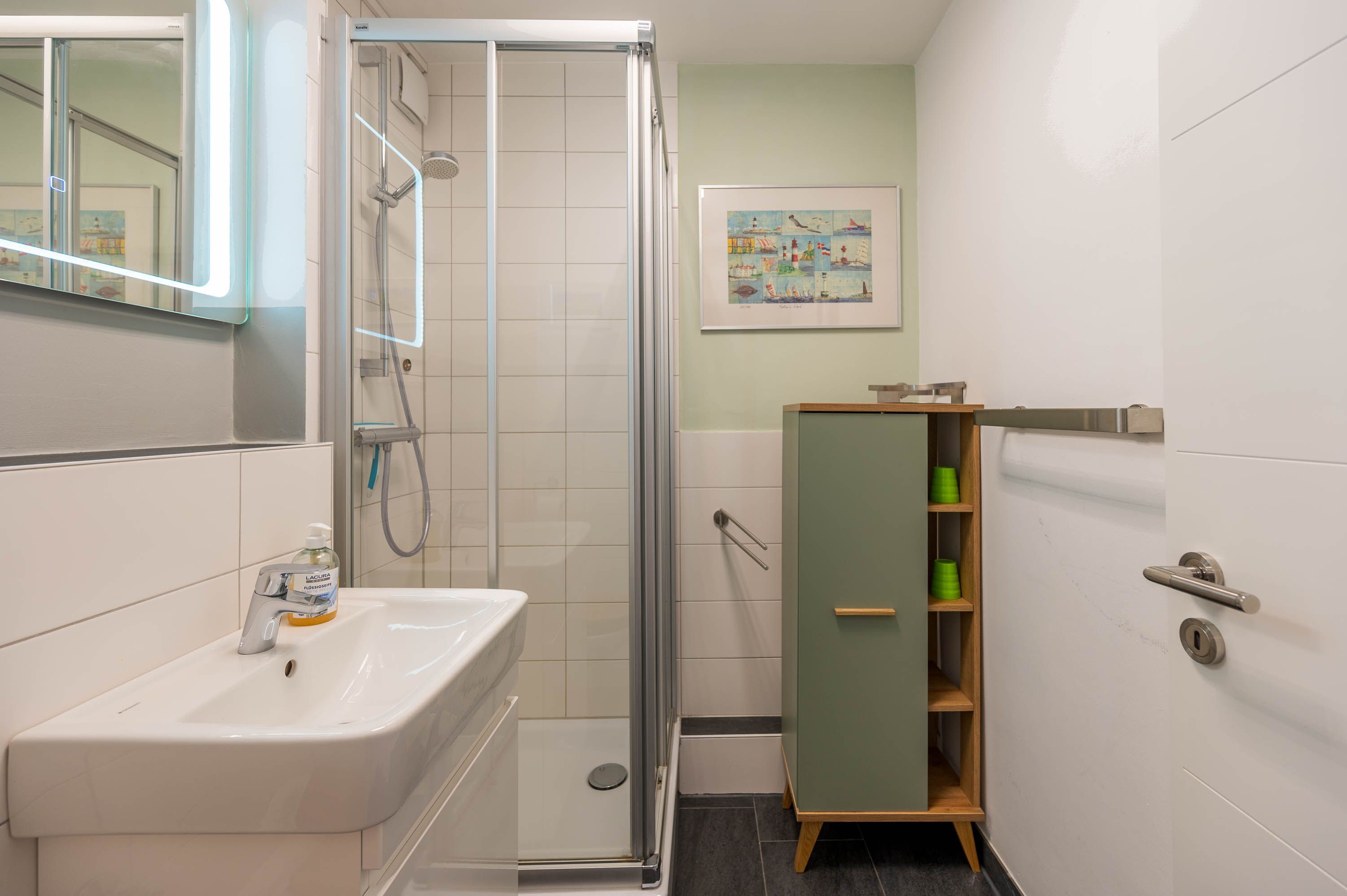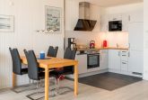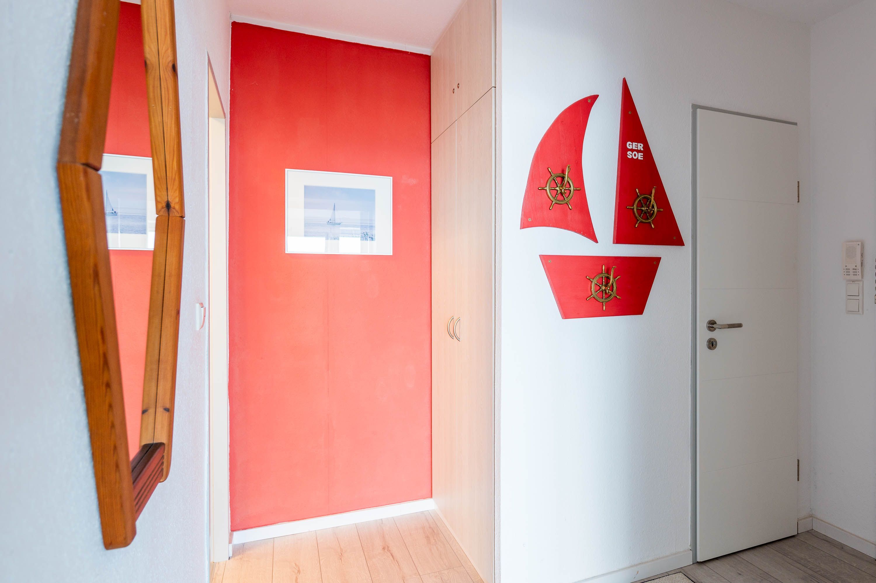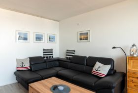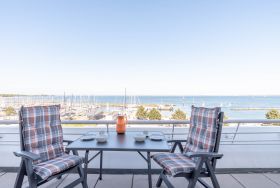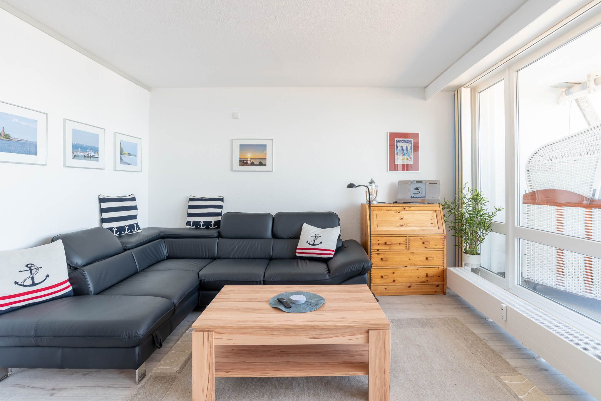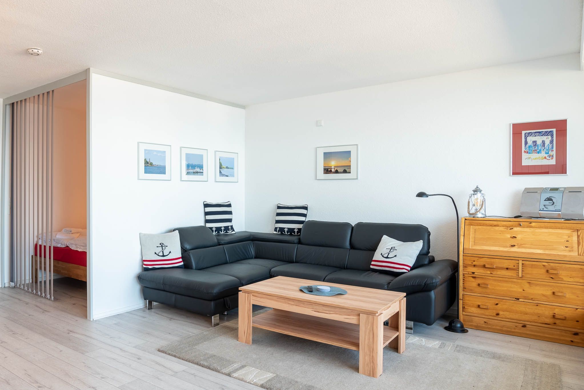 Reinkommen, staunen und sich wohlfühlen lautet hier das Motto für Ihren Urlaub. Das 1-Zimmerappartement ist hell und freundlich im maritimen Stil ausgestattet und besticht durch den traumhaften Blick auf die Ostsee, den Segelhafen, den Strand und Schiffe, Schiffe, Schiffe. Es ist immer was los und zu bestaunen und gucken - sehen und erleben Sie es selbst. Ein bequemes Ecksofa lädt zu gemütlichen Abenden ein und lässt sich mit wenigen Handgriffen zur Schlafgelegenheit für eine 3. Person umbauen. In der separaten Schlafkoje befindet sich ein Doppelbett (160 x 200). Die gut ausgestattete Einbauküche lädt zu gemeinsamen Kochaktionen mit Meeresblick ein. Ein Esstisch mit 4 Stühlen, ein Sekretär, ein Sideboard und ein 55 Zoll TV (an der Wand angebracht) vervollständigen das runde Gesamtbild der Wohnung. Im Flur befinden sich ausreichend Einbauschränke und das neue und moderne Badezimmer ist mit Dusche, Waschbecken und WC ausgestattet. Der große Balkon lädt - ausgestattet mit Strandkorb, Markise, Stühlen und einem Tisch - zum gemütlichen Frühstück bei romantischen Sonnenaufgang ein - lassen Sie sich zu jeder Zeit verzaubern und die Seele baumeln beim Weitblick auf die Ostsee.
