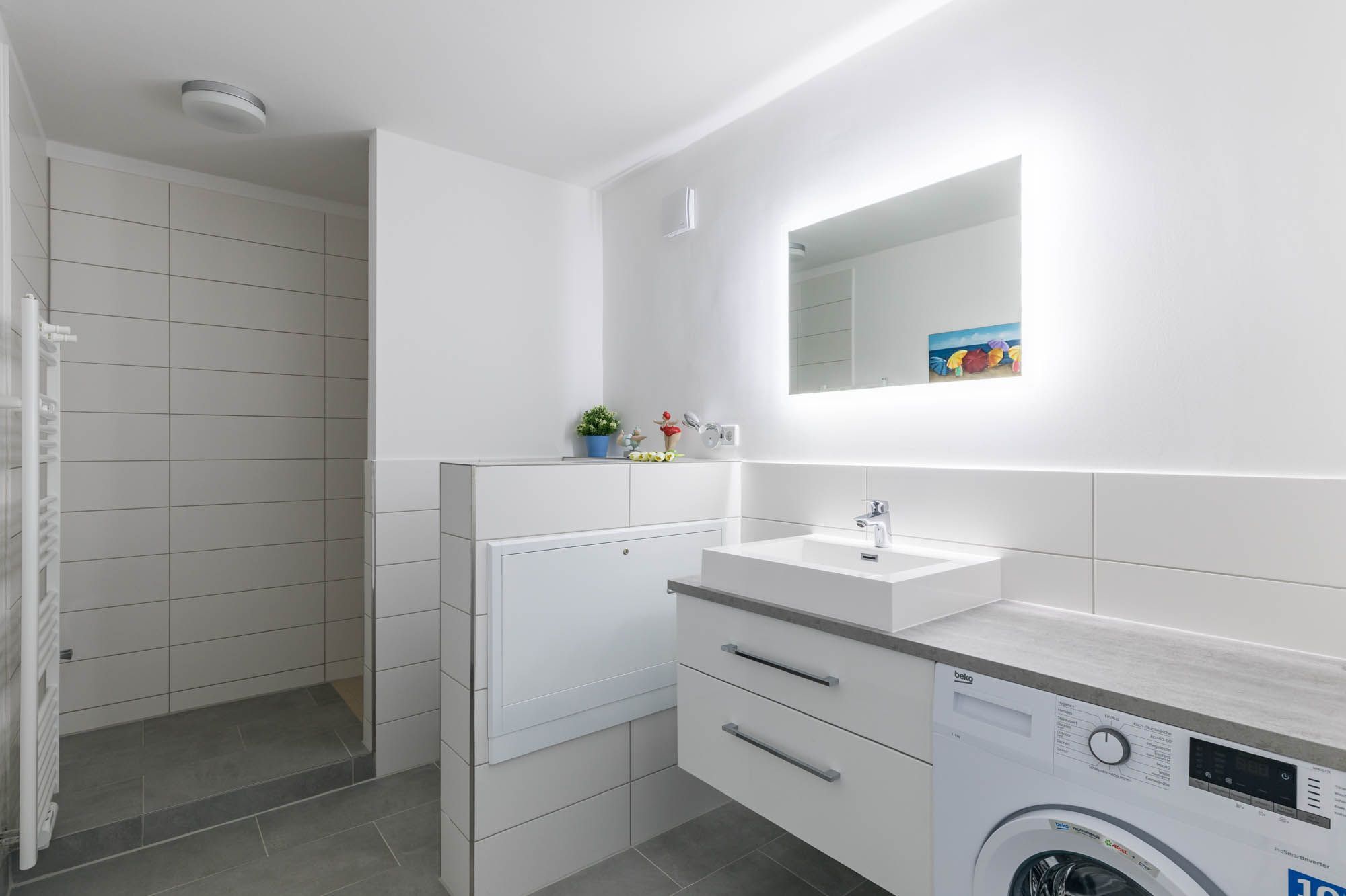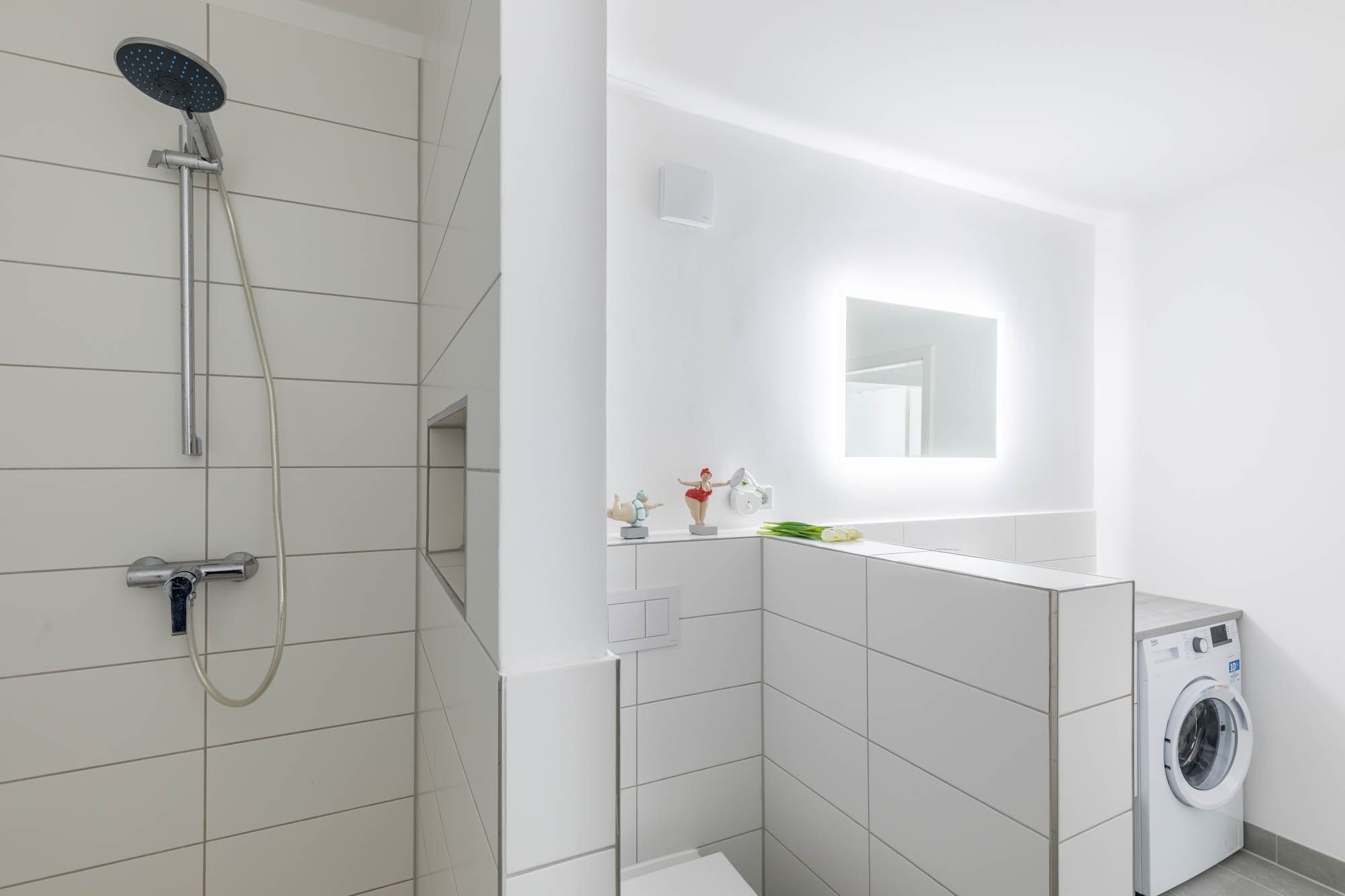 Das hell geflieste Bad ist mit Dusche und WC ausgestattet, auch eine Waschmaschine befindet sich hier.