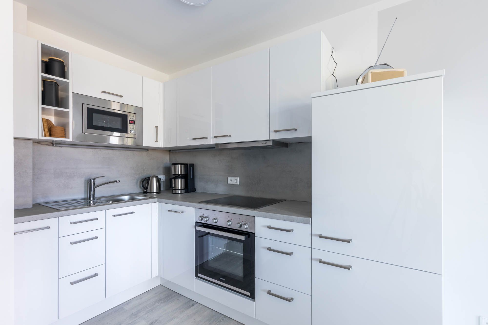 Die Wohnküche bietet neben dem Herd mit Cerankochfeld und Kühlschrank auch eine Mikrowelle und diverse typische Kleingeräte.