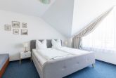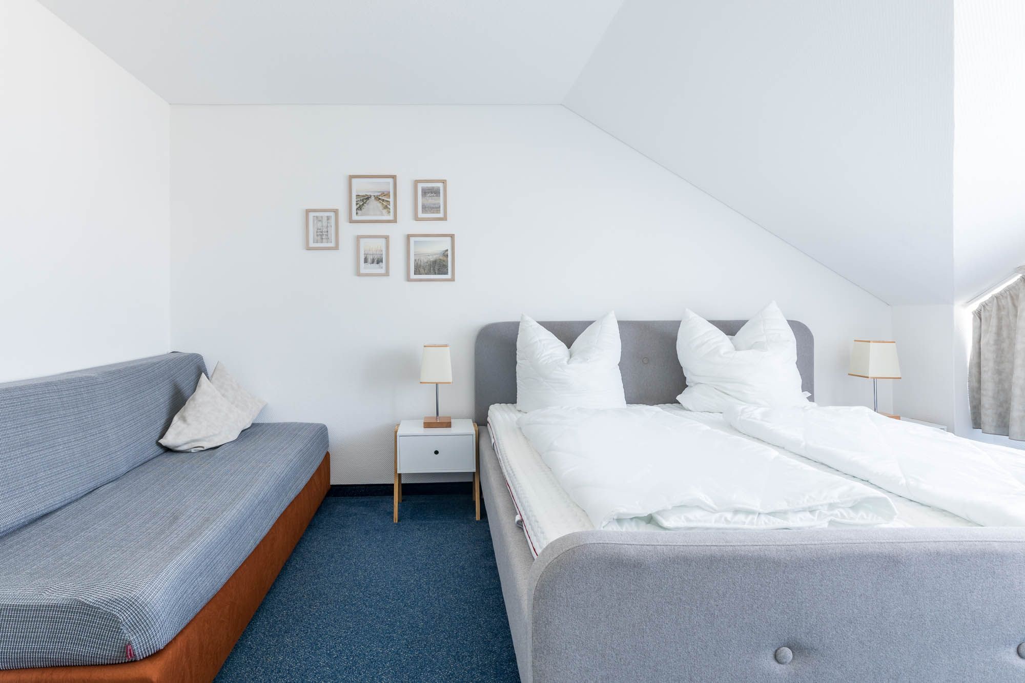 Das Schlafzimmer ist mit einem Doppelbett und einer Liege (z.B. für eines der mitreisenden Kinder) ausgestattet. Im Kleiderschrank können Sie gern Ihre Urlaubsgarderobe ablegen.