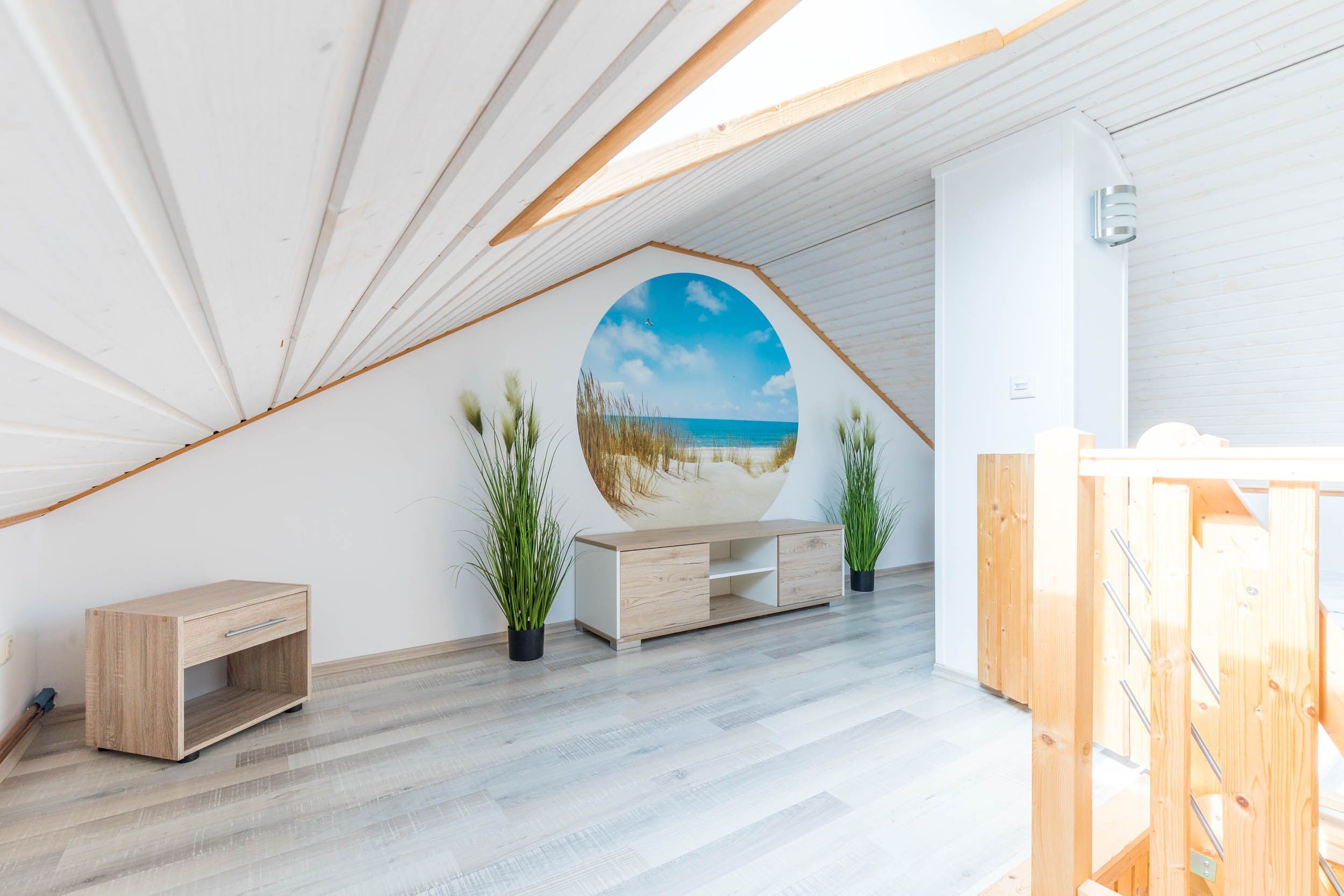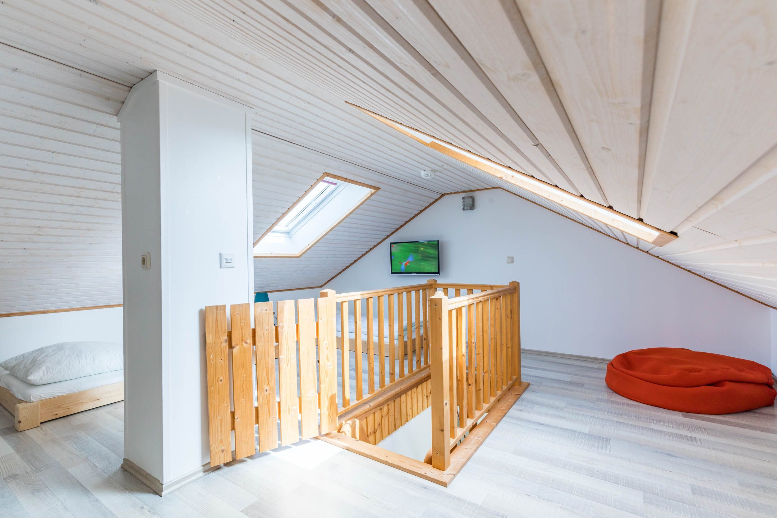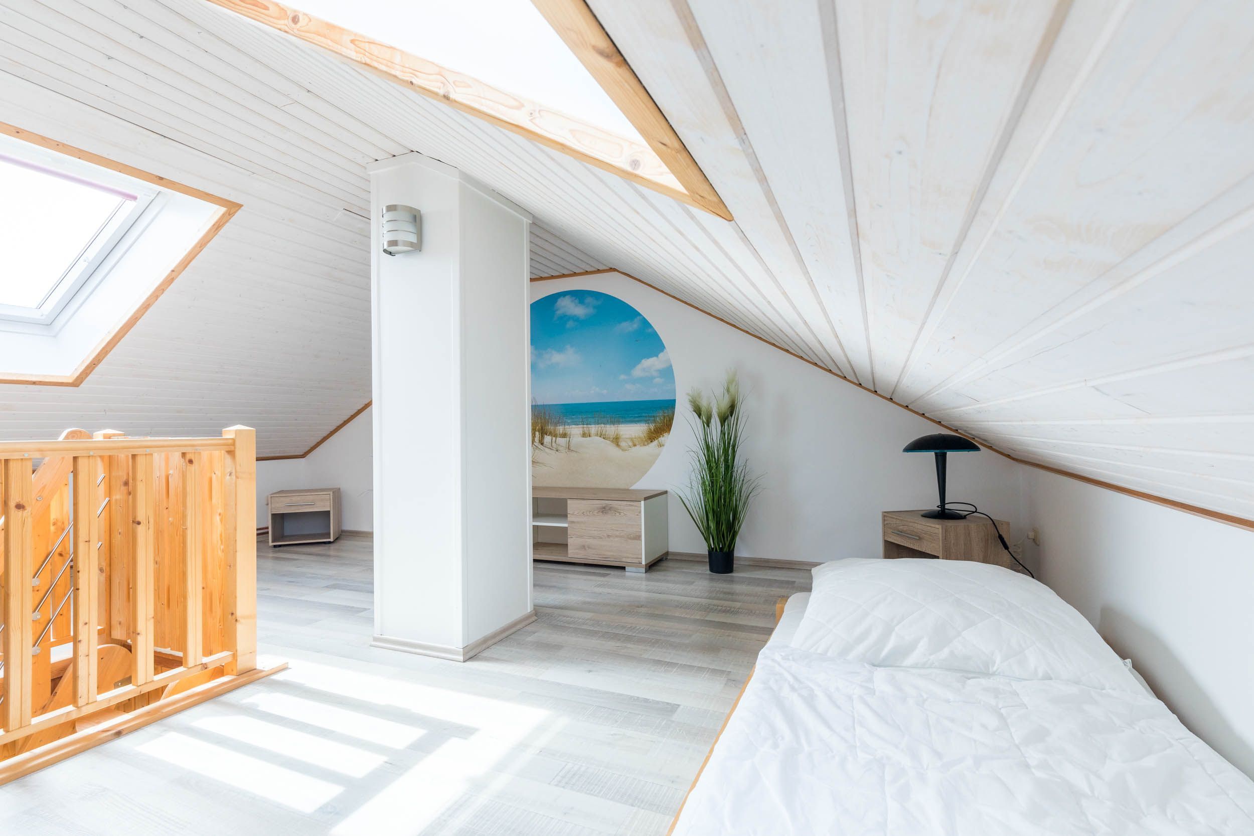Vom Wohnbereich aus gelangen Sie über eine Raumspartreppe ins offene Dachgeschoss. Dieser Bereich ist eher für größere Kinder geeignet. Hier stehen 2 flache Einzelbetten bereit. Ein eigener Flatscreen-TV an der Wand sorgt auch auf dieser Etage für Unterhaltung.