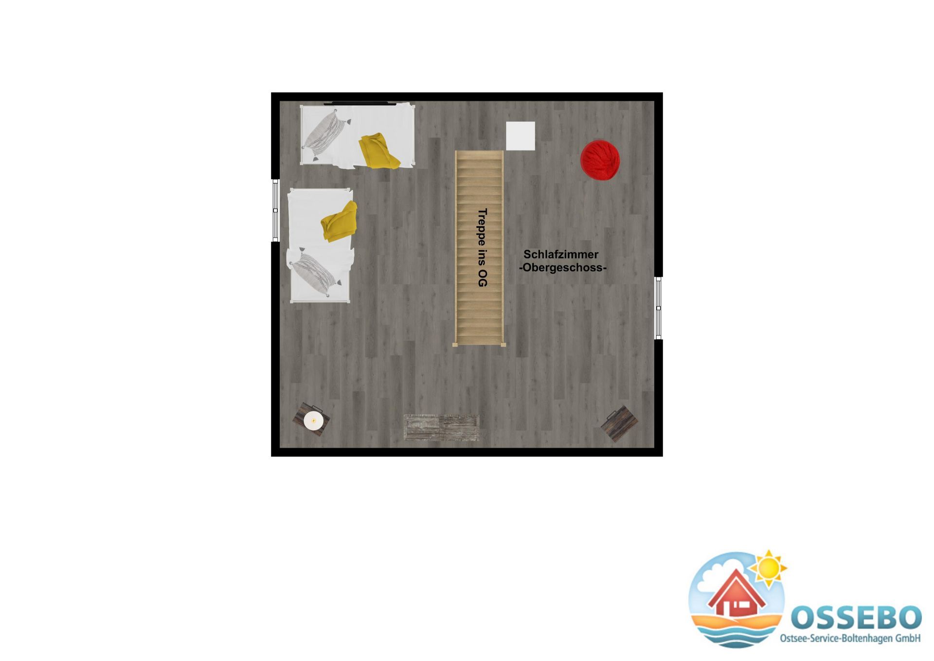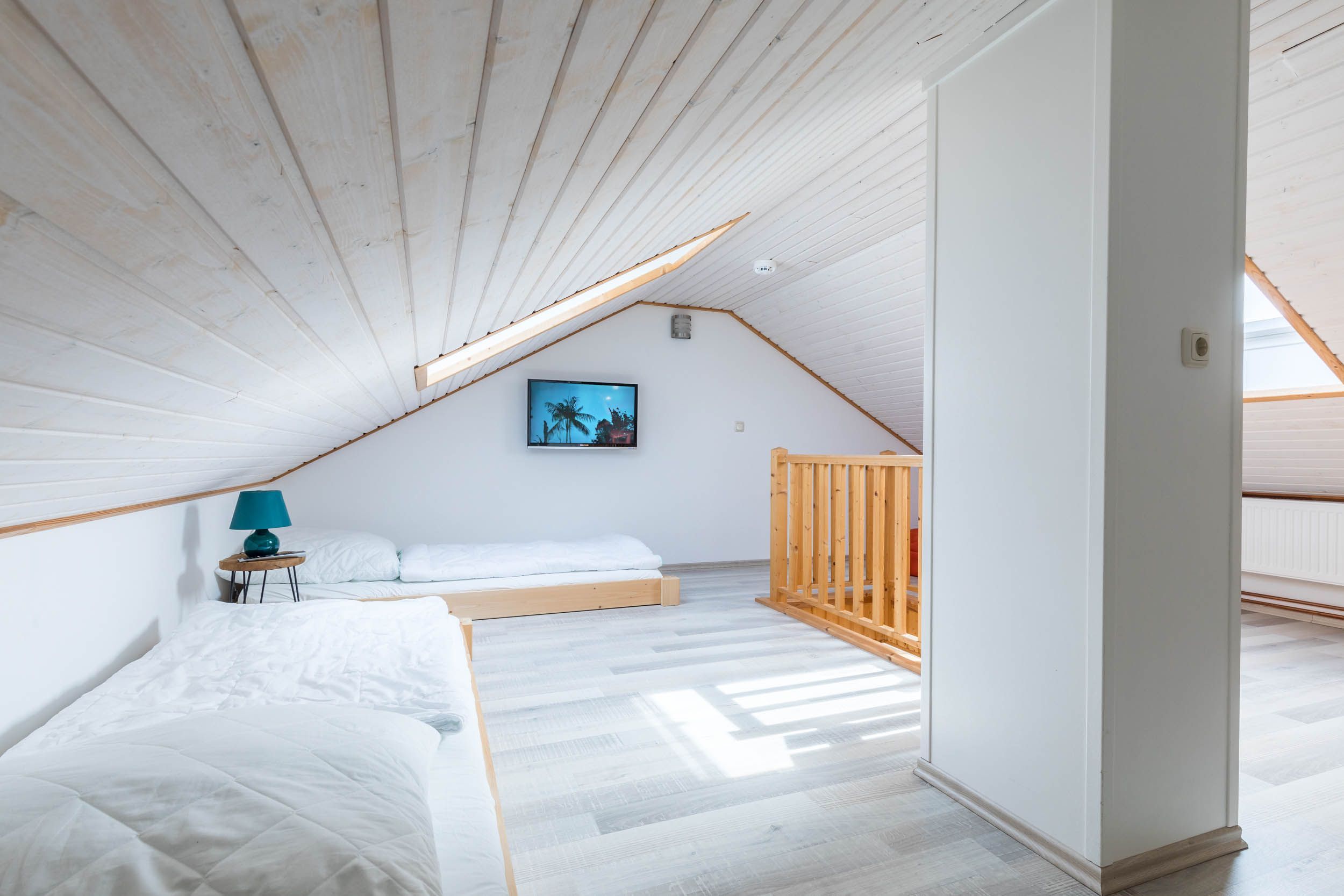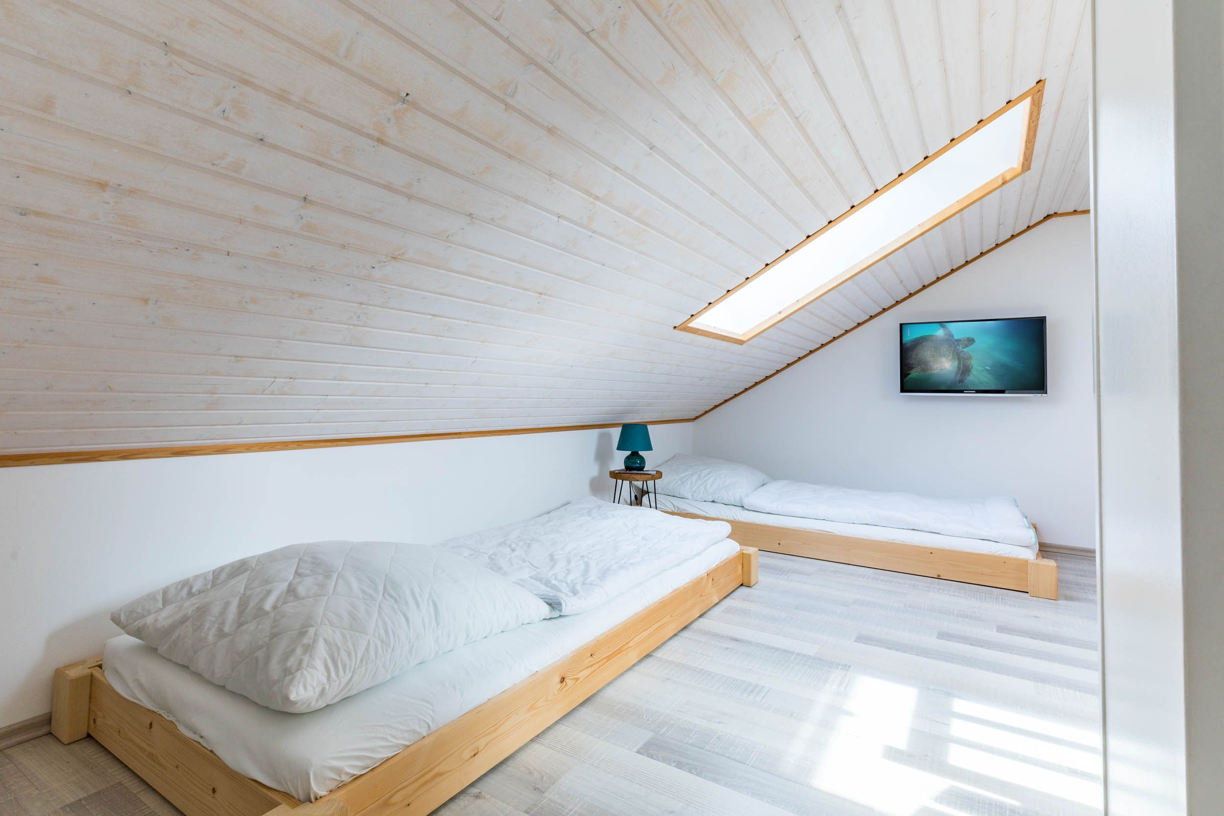 Vom Wohnbereich aus gelangen Sie über eine Raumspartreppe ins offene Dachgeschoss. Dieser Bereich ist eher für größere Kinder geeignet. Hier stehen 2 flache Einzelbetten bereit. Ein eigener Flatscreen-TV an der Wand sorgt auch auf dieser Etage für Unterhaltung.