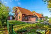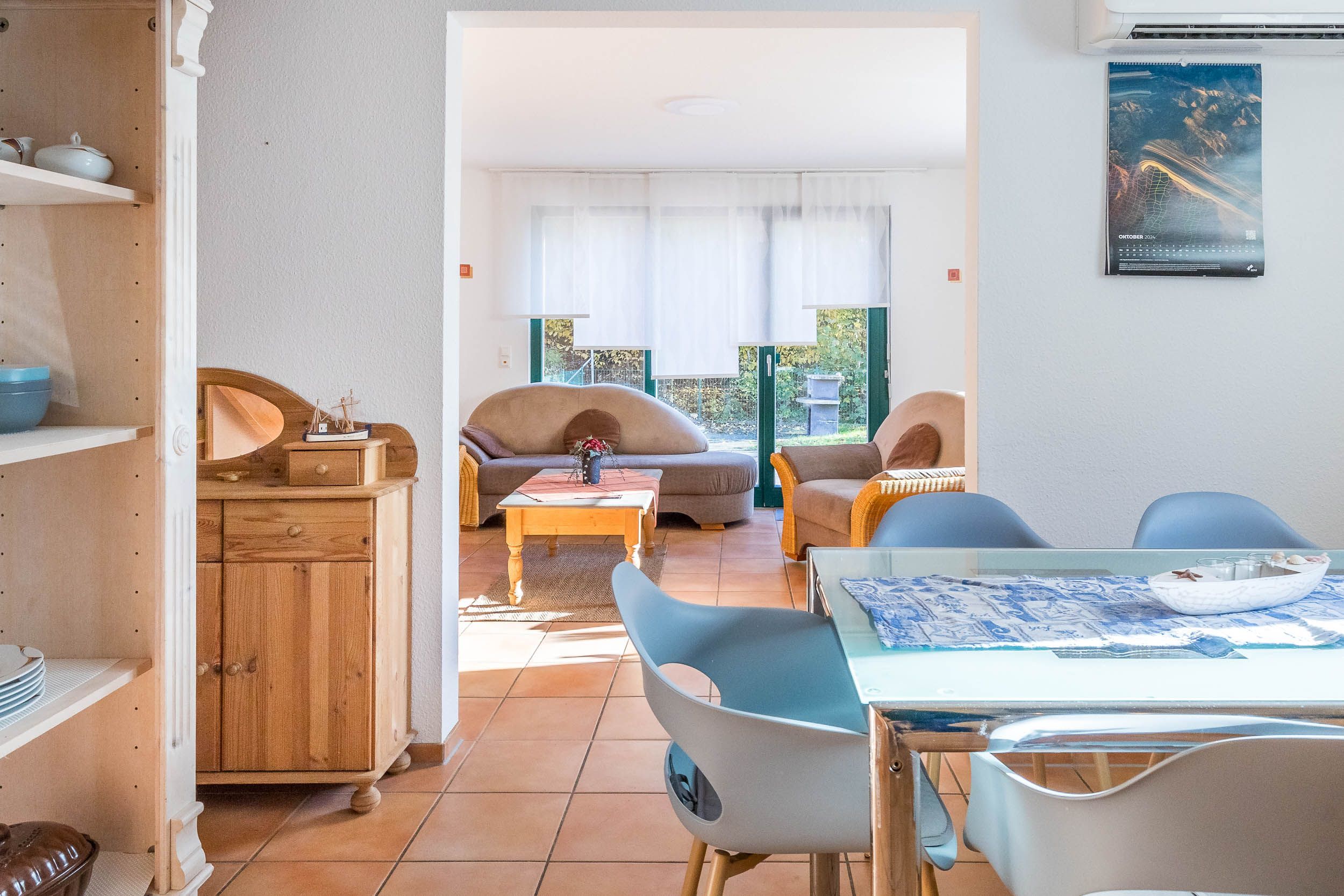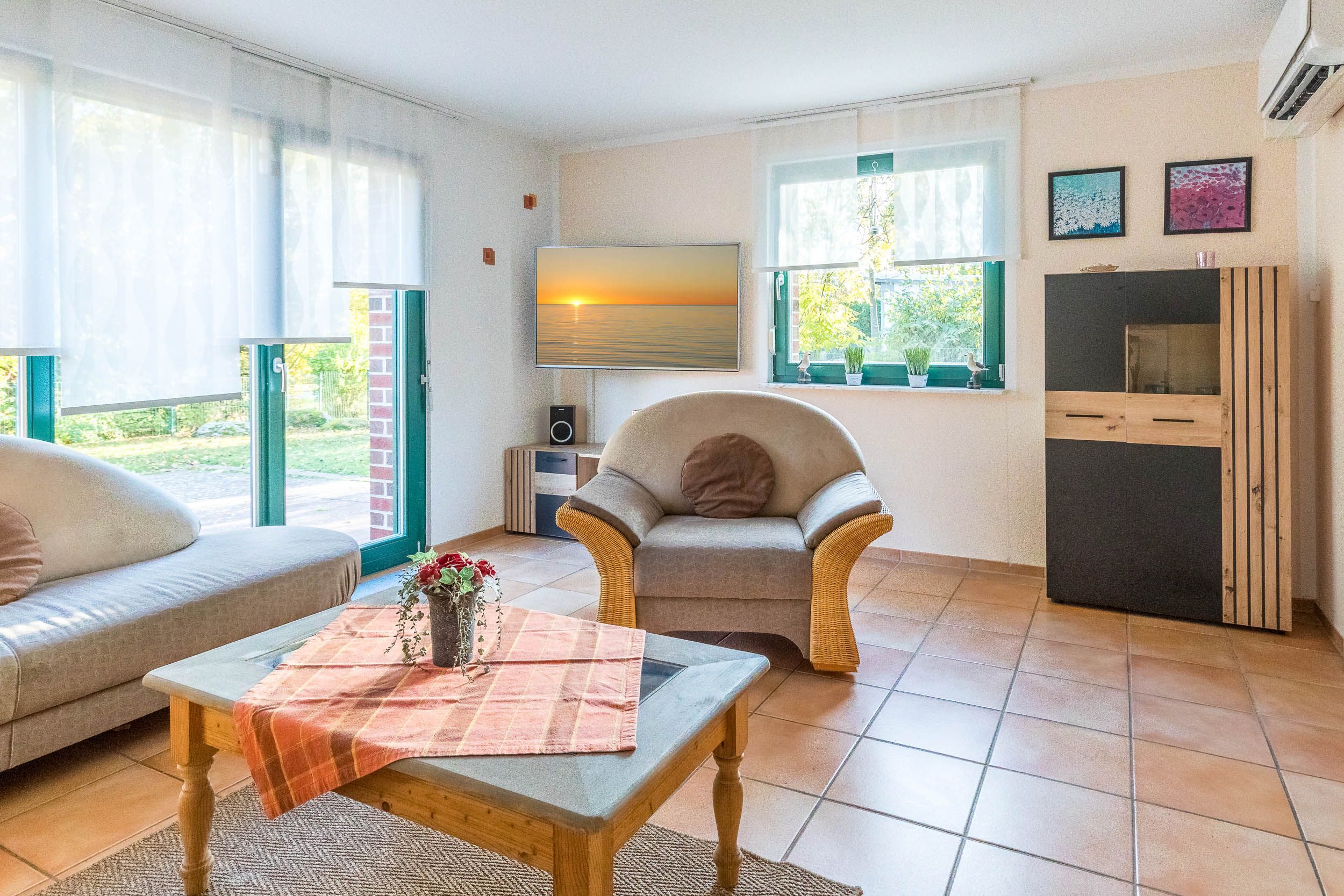 Die große Couchgarnitur und der Flatscreen-TV im Wohnzimmer laden zum gemütlichen Beisammensein ein. Von hier aus gelangen Sie auch auf die möblierte Südost-Terrasse mit eingezäuntem Grundstück herum.