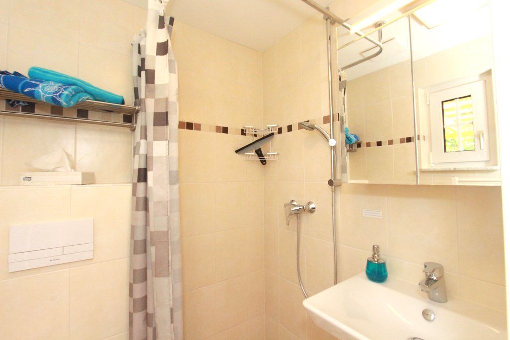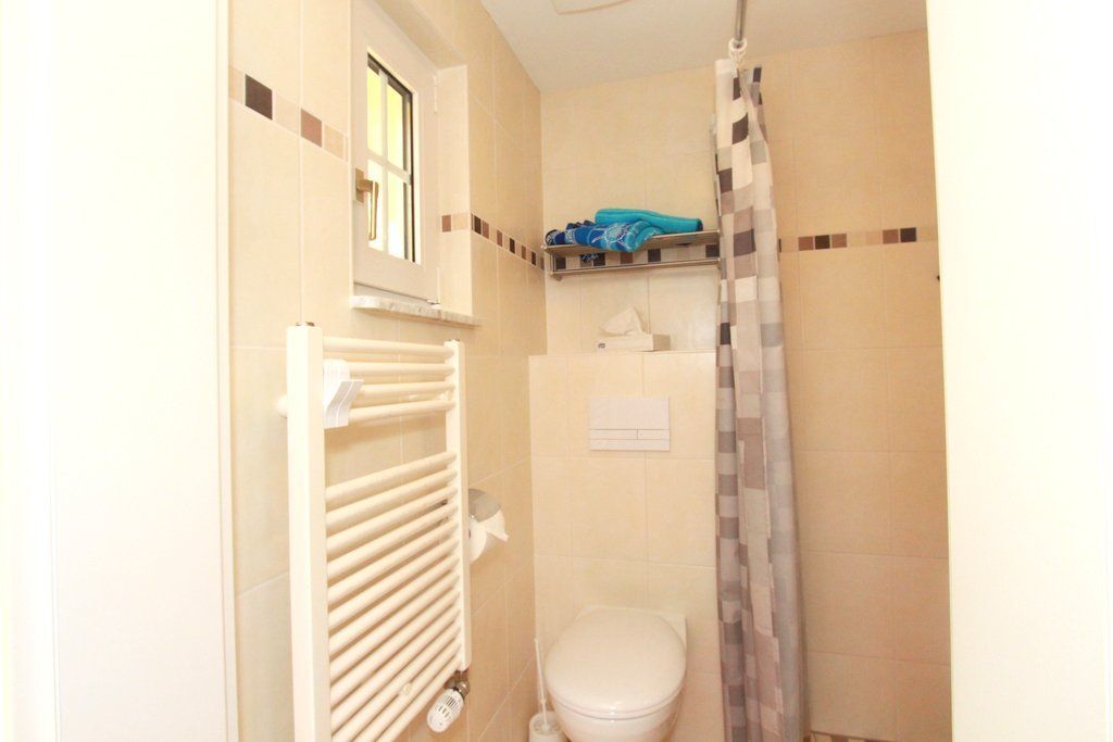 Die bodentiefe Dusche mit Duschvorhang sowie eine Fußbodenheizung im gefliesten Badezimmer erfreuen nicht nur Senioren. Ein kleines Fenster sorgt für Tageslicht und erleichtert das Lüften nach dem Duschen.