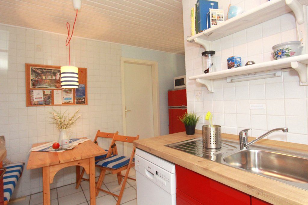 Starten Sie in der hellen, modern ausgestatteten separaten Küche mit einem guten Frühstück in den Tag. An der hier vorhandenen Essecke können Sie Ihre Mahlzeiten einnehmen.