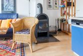Im gemütlichen Wohnbereich im Erdgeschoss finden Sie ein Sofa, eine Essecke, einen großen Flatscreen-Fernseher sowie einen zum Wohlfühlen einladenden Kamin.