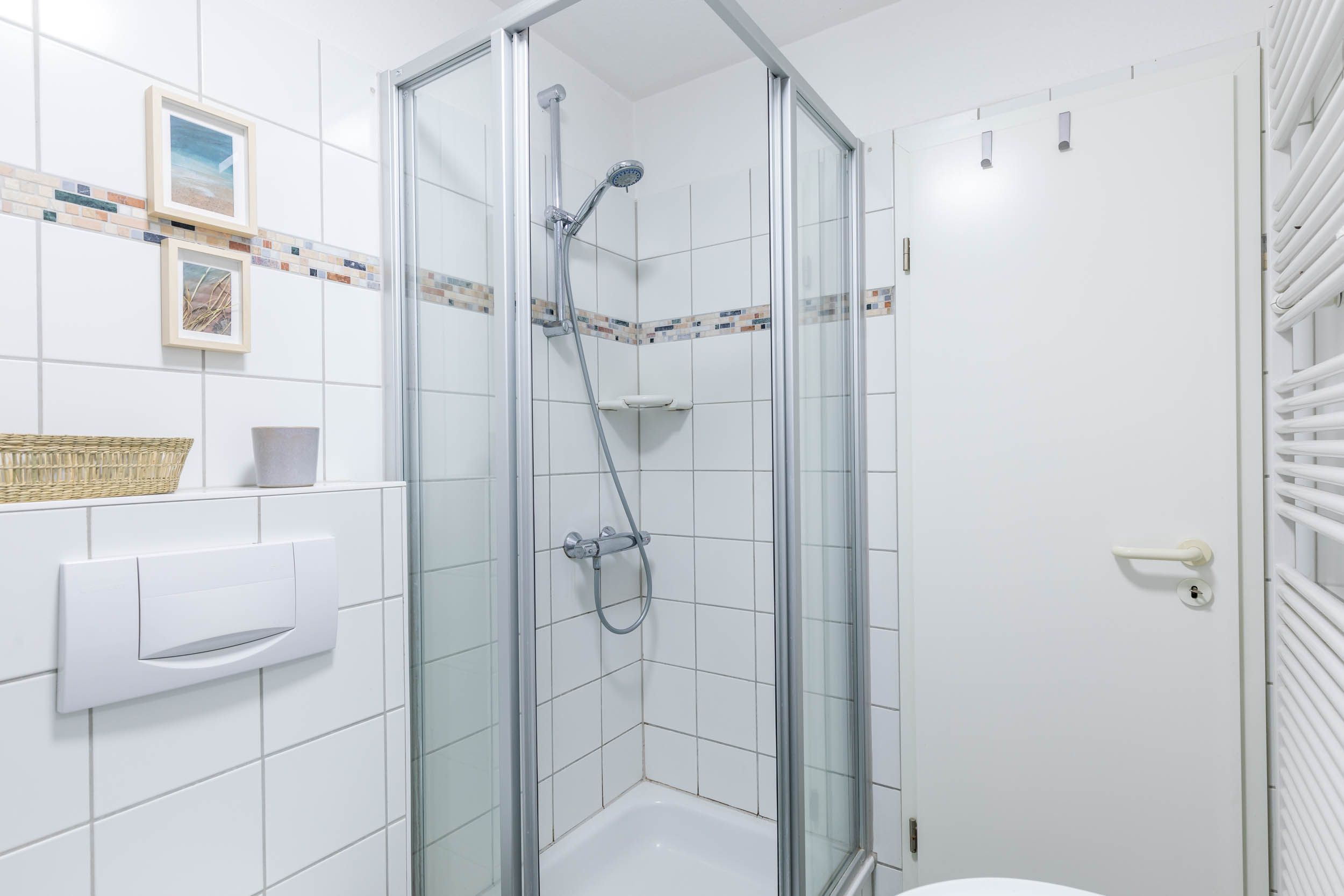 Das Badezimmer auf selbiger Etage bietet neben Dusche/WC und Handtuchtrockner auch eine kostenfrei nutzbare Waschmaschine. Für die kleinsten Urlauber gibt es hier auch einen klappbaren Wandwickeltisch.