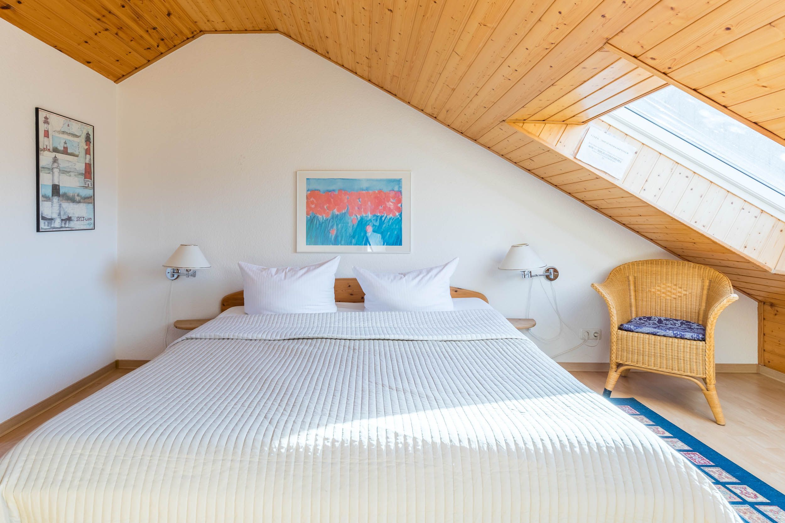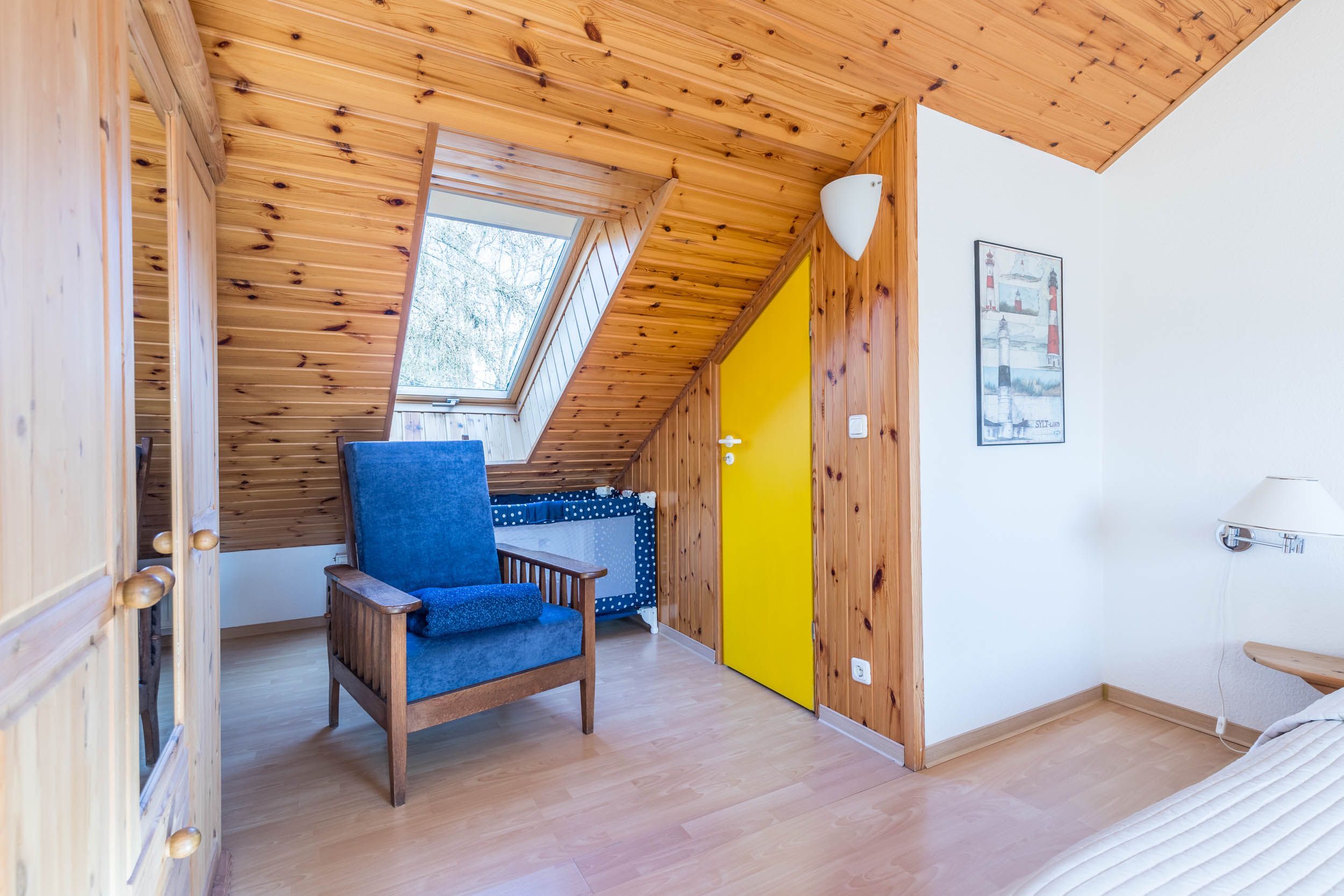 Im Dachgeschoss ist das Schlafzimmer mit einem Doppelbett und einem großzügigen Kleiderschrank eingerichtet. Ein weiterer SAT-TV sorgt auch auf dieser Etage für Unterhaltung. Hier finden Sie auch genügend Platz für ein Reisebettchen.