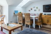 In der 1. Wohnebene finden Sie das Wohnzimmer mit großem Ecksofa, Flatscreen-TV, Essecke und einer kleinen offenen Küche.
