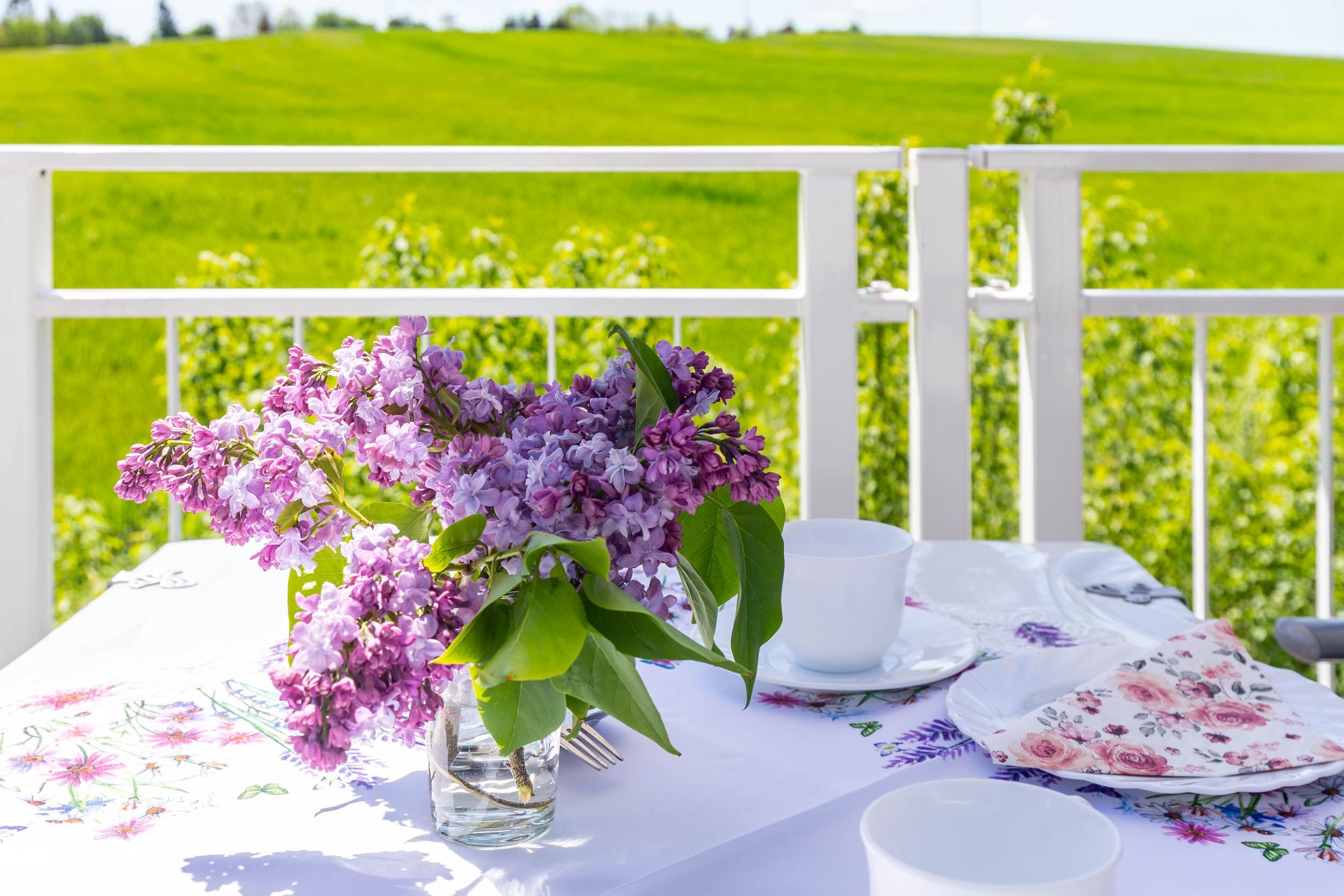 Von hier aus begehen Sie auch den möblierten Südbalkon mit Blick ins Grüne.