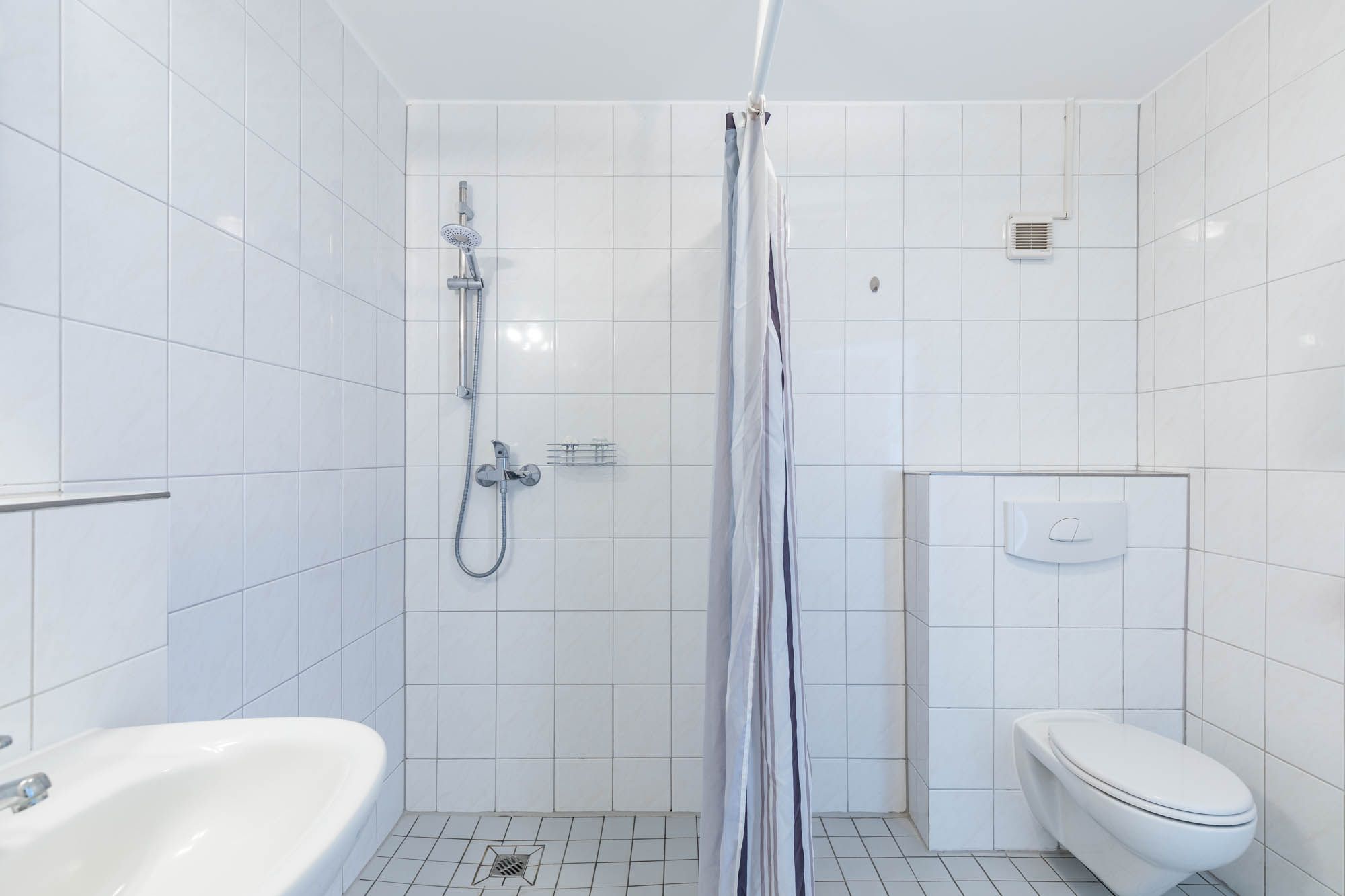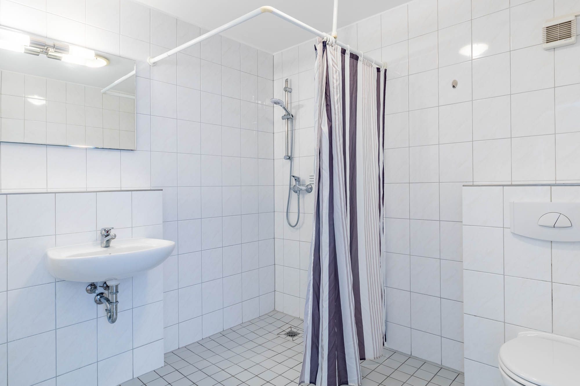 Ein hell gefliestes Badezimmer mit geräumiger Dusche und WC vervollständigen die Ferienwohnung. Die Wohnung verfügt überall über extrabreite, ebenerdige Türen, sodass der Zugang u.a. für Rollstühle problemlos möglich ist.