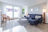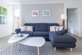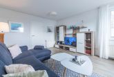 Das Wohnzimmer ist mit einem Ecksofa sowie einem passenden Sessel eingerichtet. Ein großer TV und die Stereoanlage sorgen hier für gute Multimediaunterhaltung. Die angrenzende Essecke bietet Platz für 4 Gäste.
