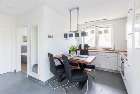 Die offene Einbauküche bietet eine Vollausstattung, so sind hier u.a. Herd, Backofen, Kühlschrank mit Gefrierfach, Geschirrspüler, Mikrowelle uvm. Ein passender Esstisch rundes das Paket ab.