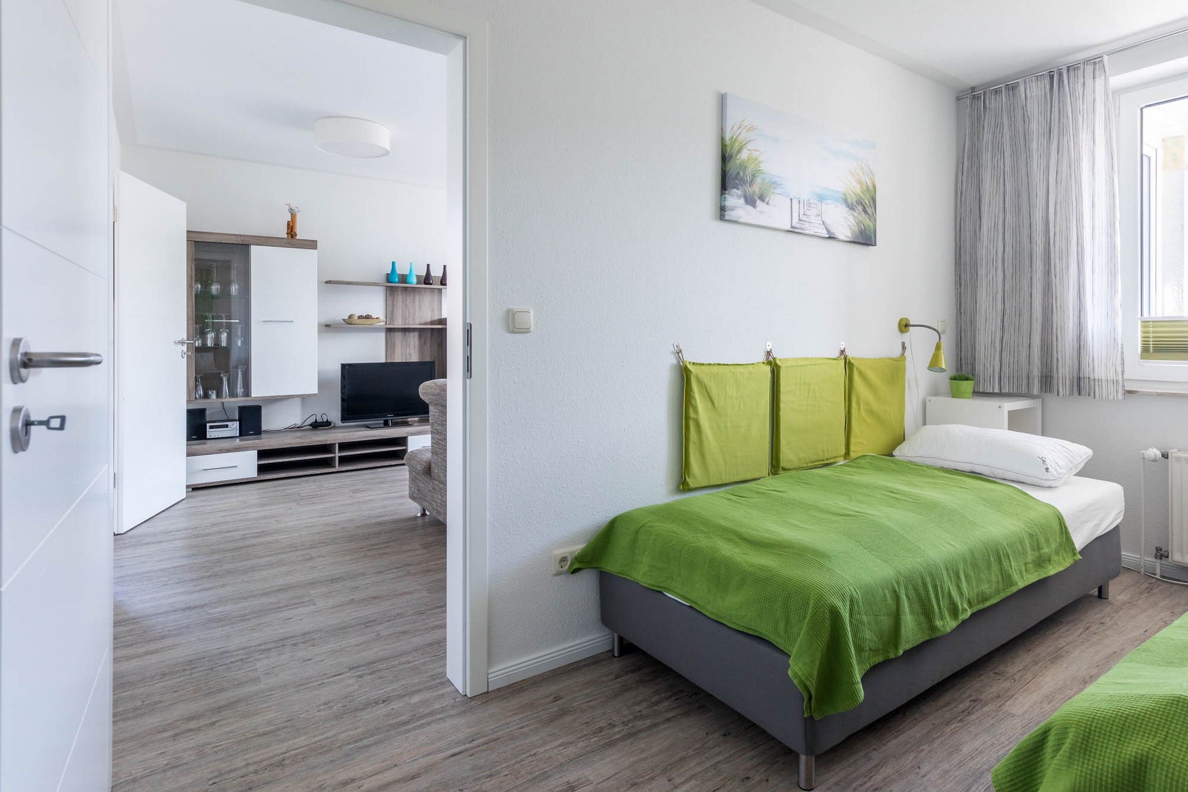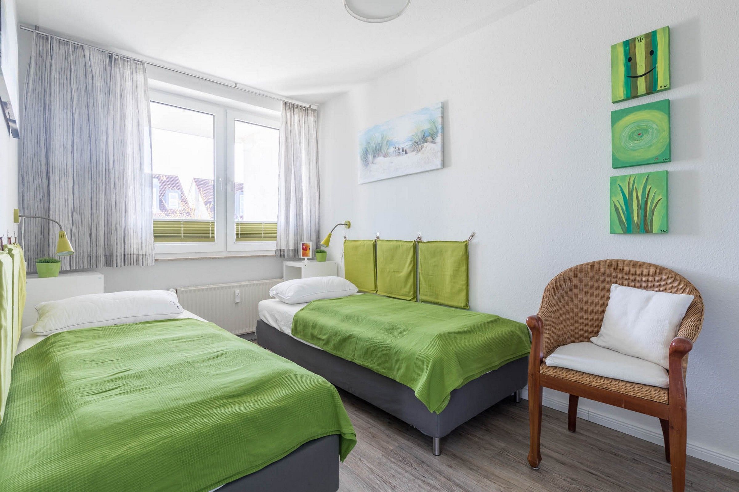 Das zweite Schlafzimmer ist mit zwei Einzelbetten (90x200m) und einem Kleiderschrank ausgestattet.