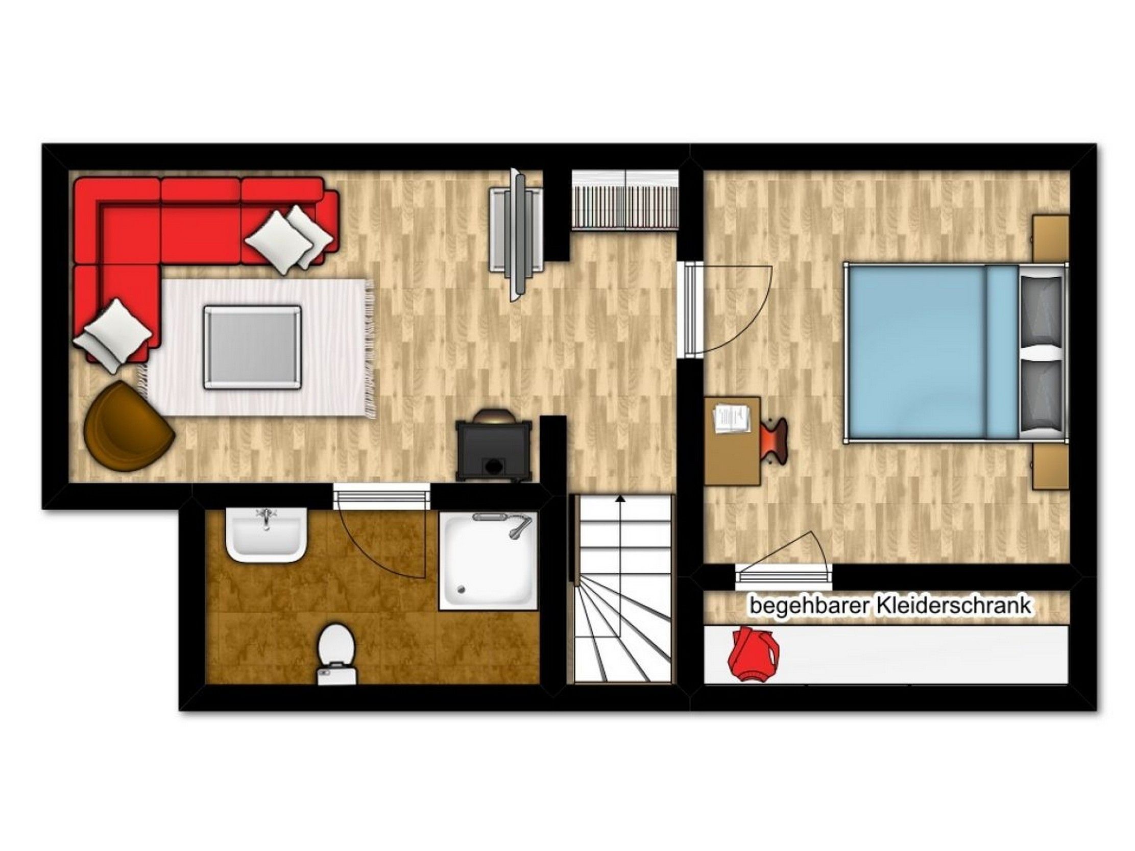 Über eine Treppe gelangen Sie in das 1.Obergeschoss, wo Sie der gemütliche Wohnbereich erwartet.