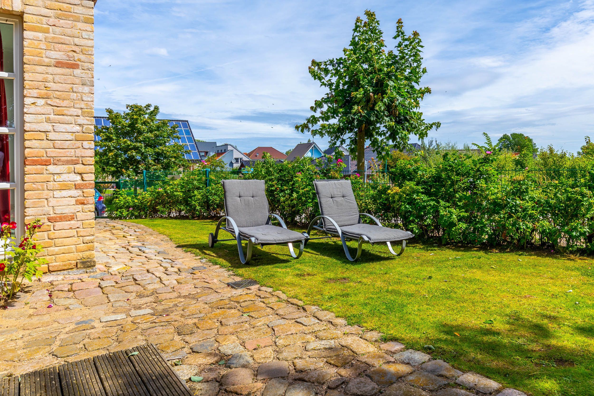 Eine große, ruhige, schön möblierte Naturstein-Südterrasse - mit direktem Blick auf die Ostsee - lädt zu einem gemütlichen Frühstück oder abendlicher Entspannung ein. Die schön angelegte möblierte Süd-Terrasse mit eigenem gemütlichem Strandkorb und Grün herum erreichen Sie vom Küchen-/ Essbereich.