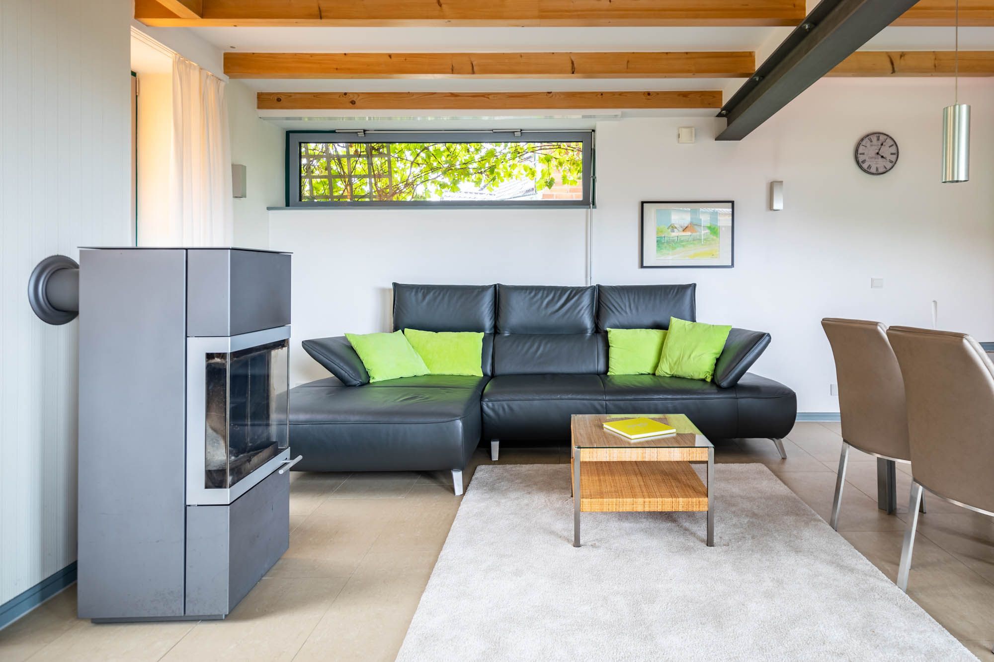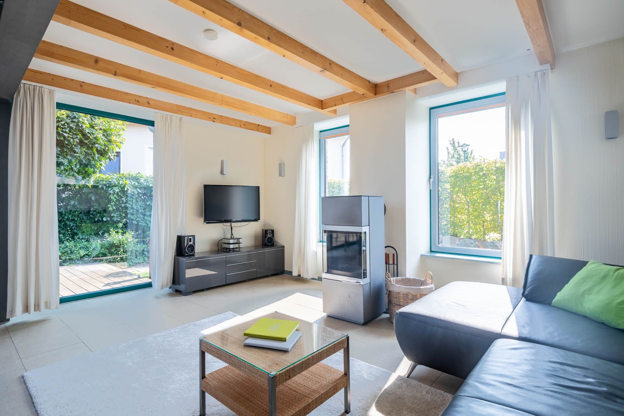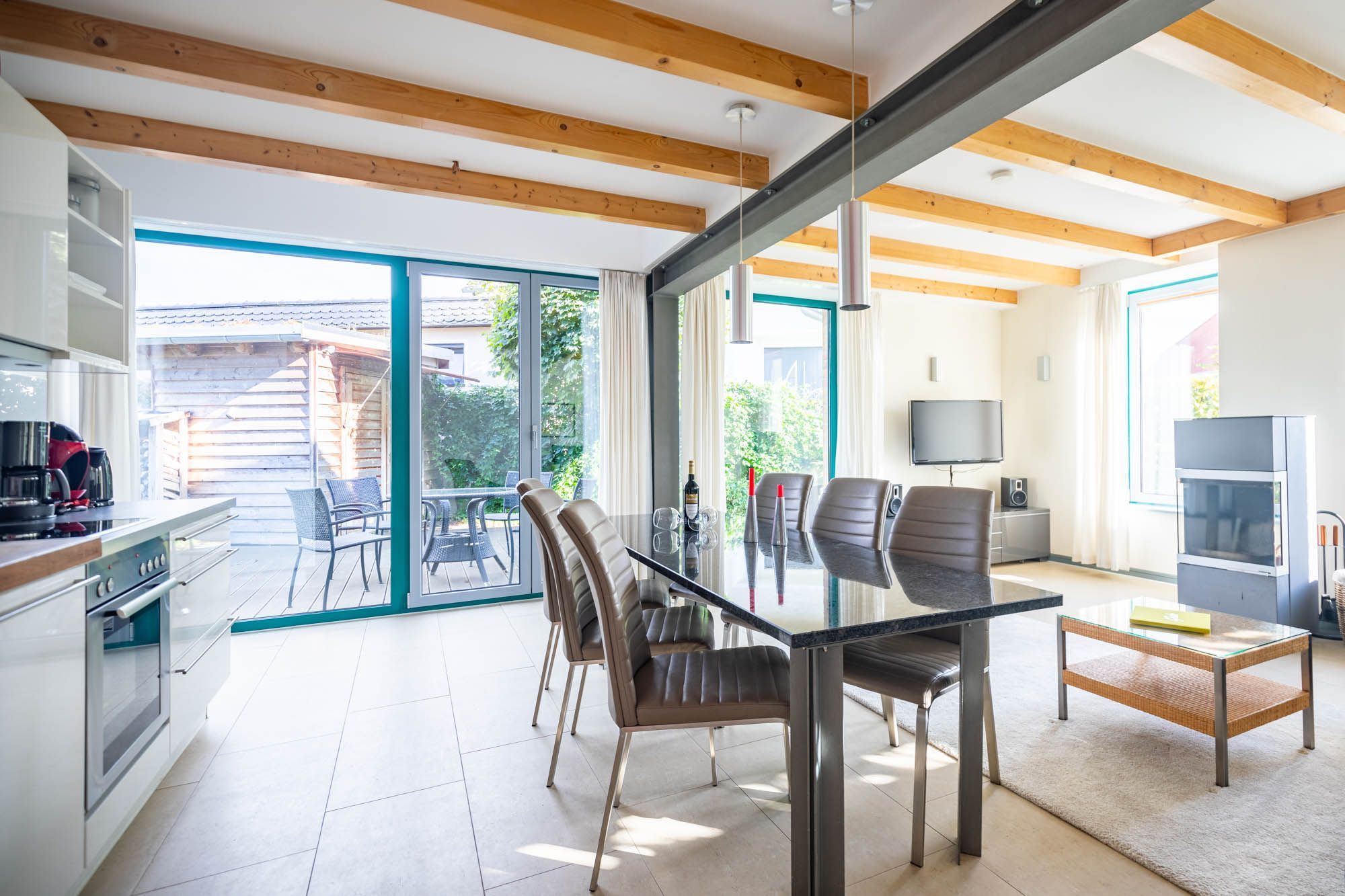 Im Erdgeschoss werden Sie von einem stilvoll eingerichteten Wohn- und Essbereich mit Ostseeblick und Kamin empfangen. Das Kaminholz liegt für Sie bereit und kann gerne genutzt werden. Flatscreen-TV und DVD-Player sorgen auf Wunsch für Unterhaltung.