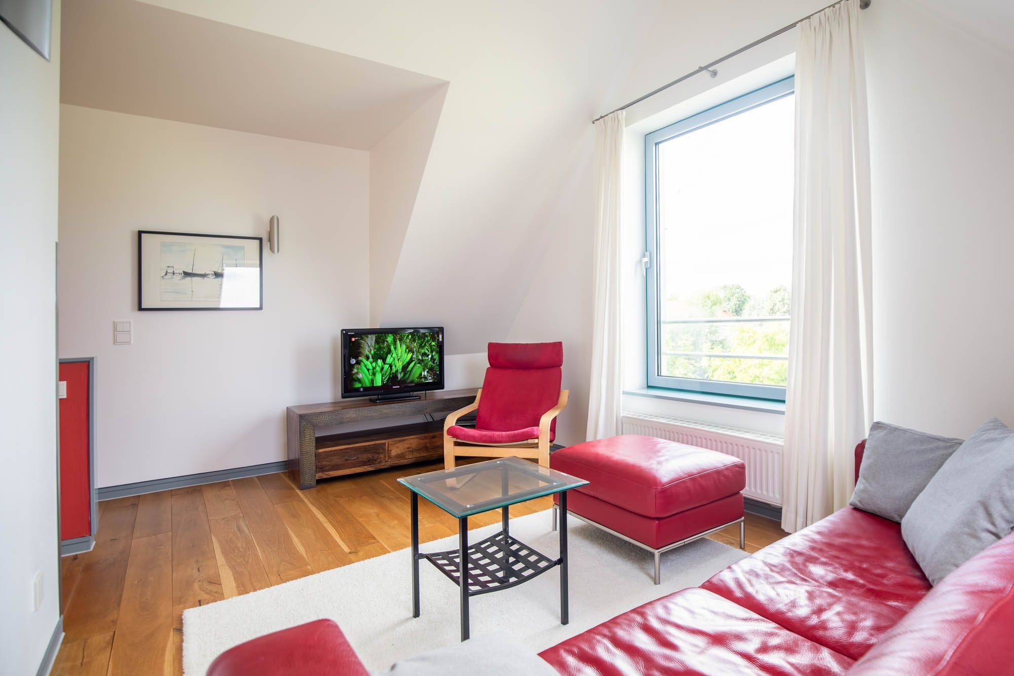 Hier begrüßt Sie ein offener Bereich mit Sofa sowie ein 2. TV-Gerät. In einer separaten Ecke können Sie in Ruhe an dem Schreibtisch schreiben, zeichnen, Arbeiten erledigen.