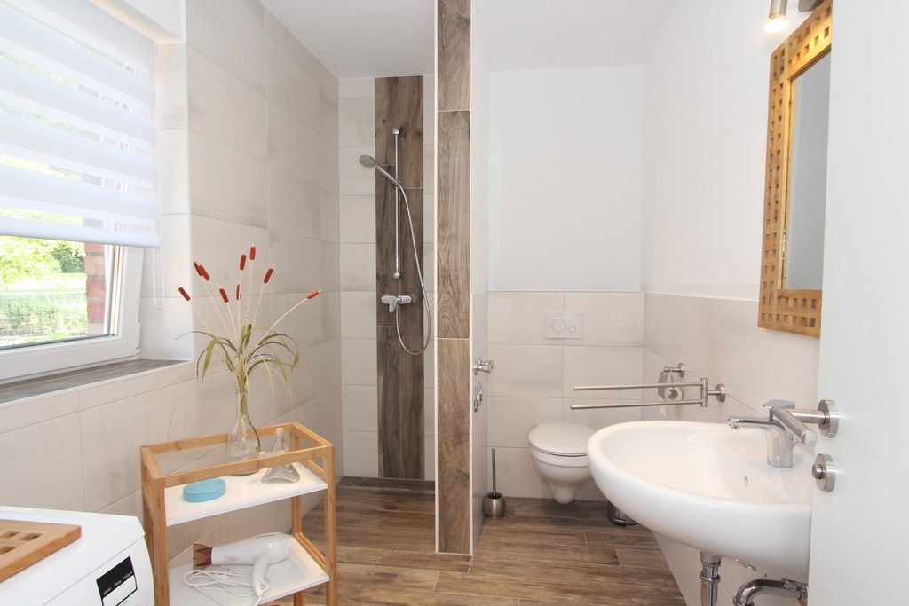 Ebenso befindet sich auf dieser Etage das erste der beiden modernen Bäder. Es bietet Tageslicht, eine bodengleiche Dusche und WC. Auch eine kostenlose Waschmaschine steht hier zur Nutzung bereit.