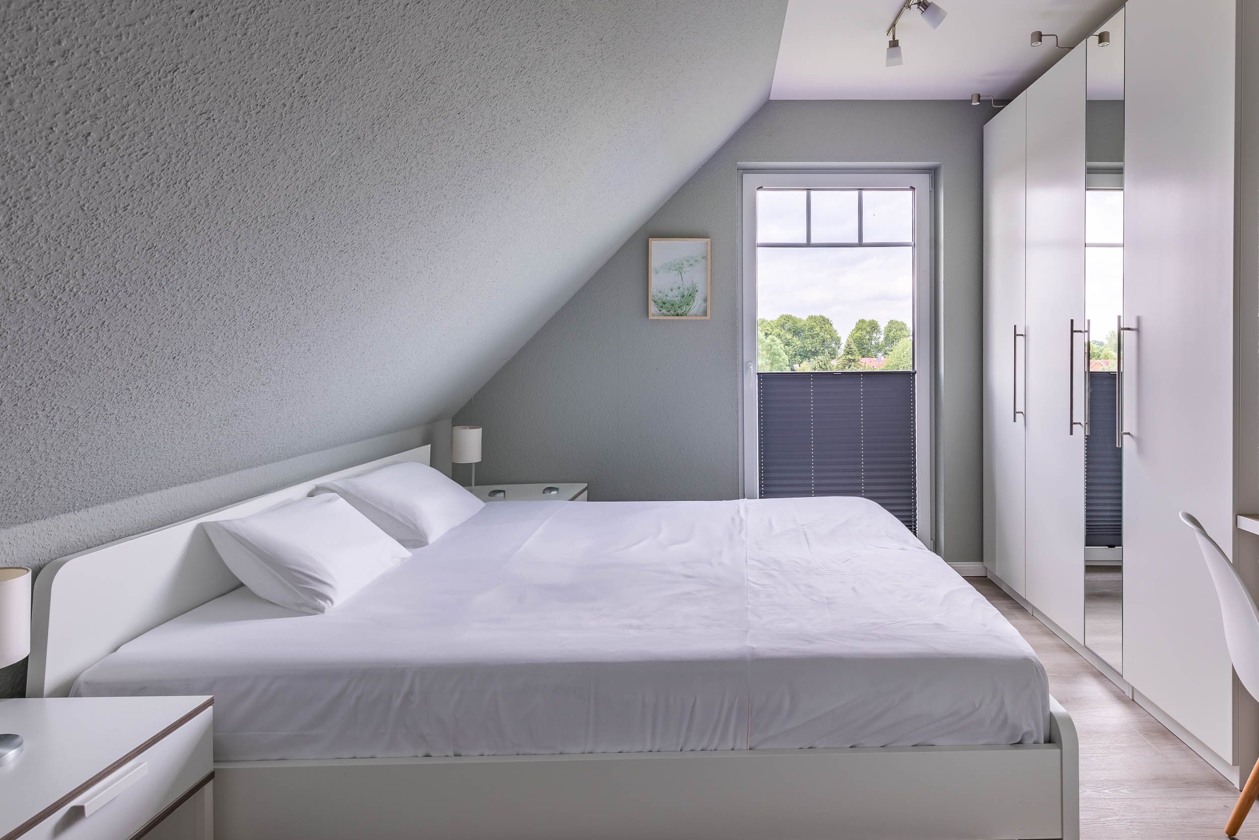 Das erste Schlafzimmer ist mit einem Doppelbett (160x200) und Schreibtisch mit LAN-Anschluss ausgestattet und bietet einen schönen Blick auf die Ostsee.